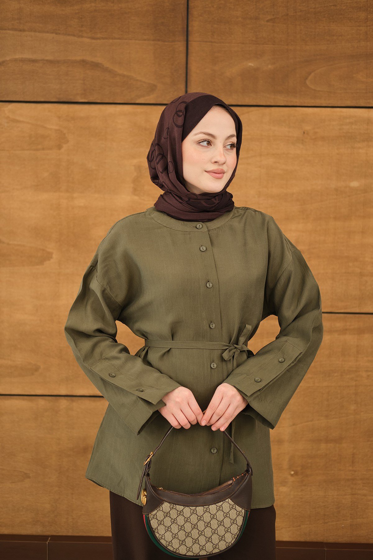 Kolları Düğme Detay Bisiklet Yaka Gömlek Haki Yeşil