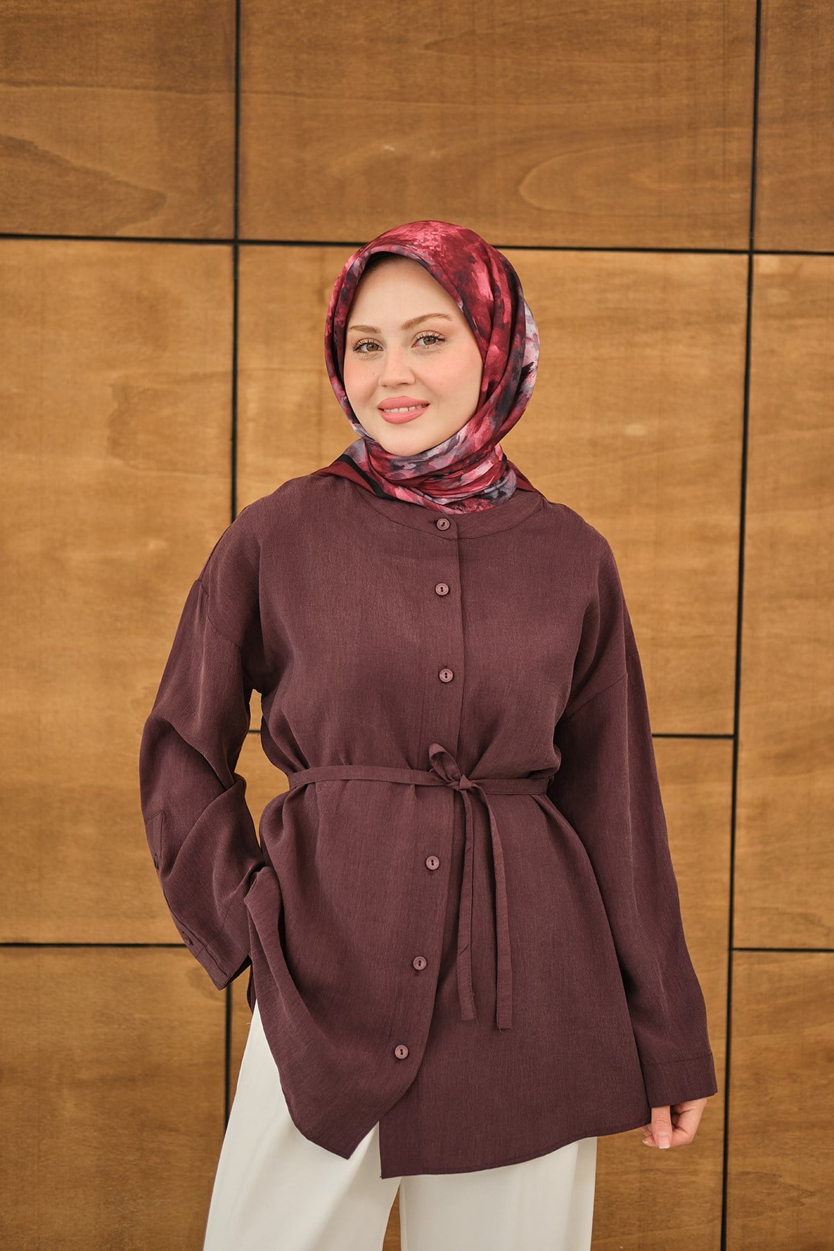 Kolları Düğme Detay Bisiklet Yaka Gömlek Mürdüm