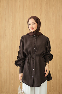 Kolları Fırfırlı Bel Bağlamalı Gömlek Kahverengi