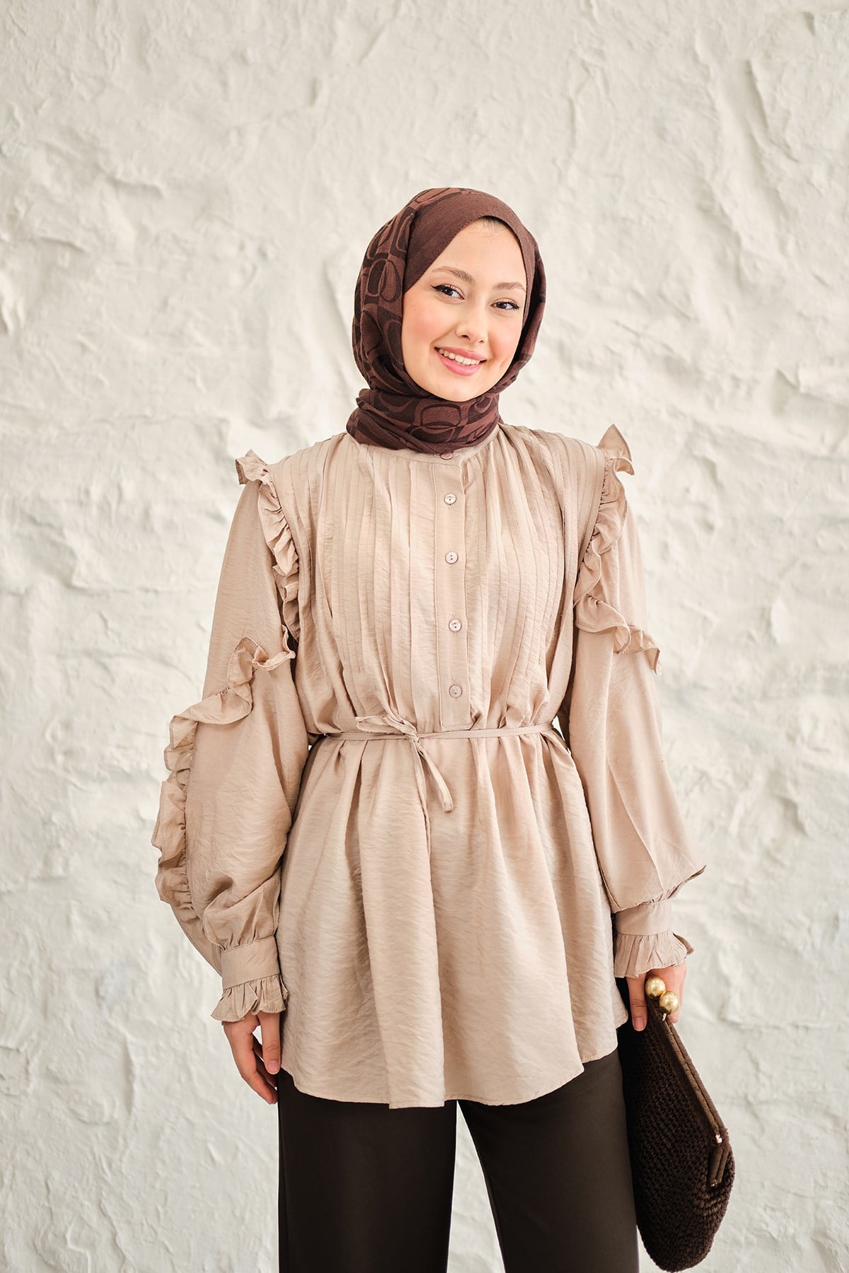 Kolları Nervurlu Önü Pileli Gömlek Bej