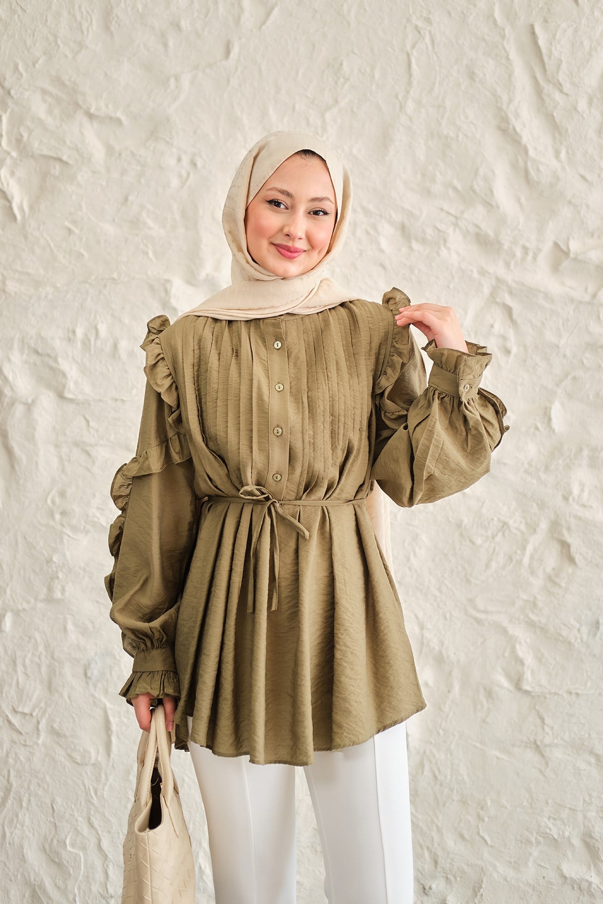 Kolları Nervurlu Önü Pileli Gömlek Küf Yeşil