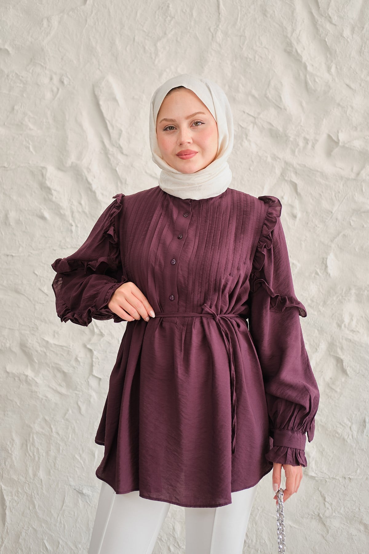 Kolları Nervurlu Önü Pileli Gömlek Mor
