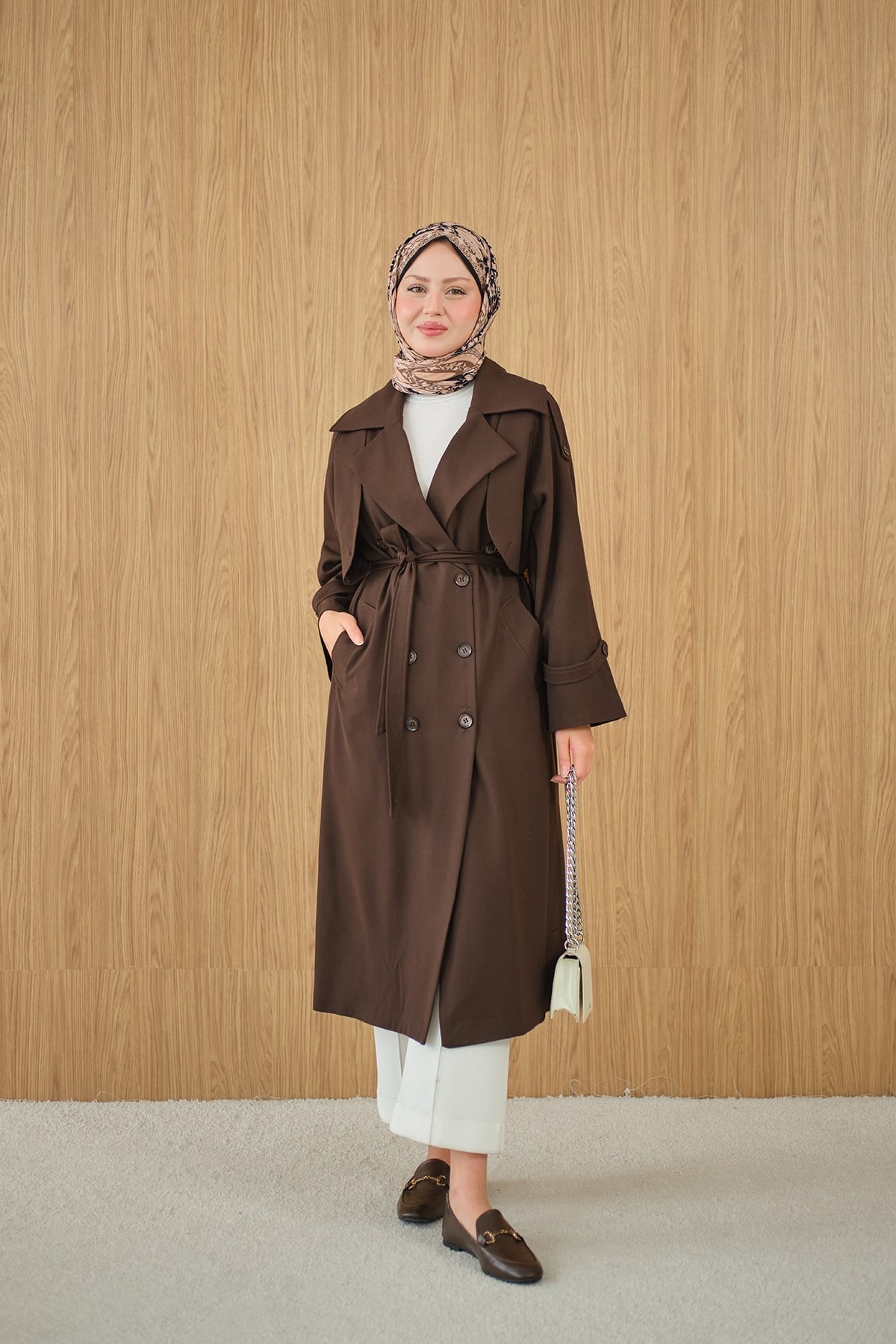 Kruvaze Yaka Bel Bağlamalı Çift Cepli Trenç Kahverengi