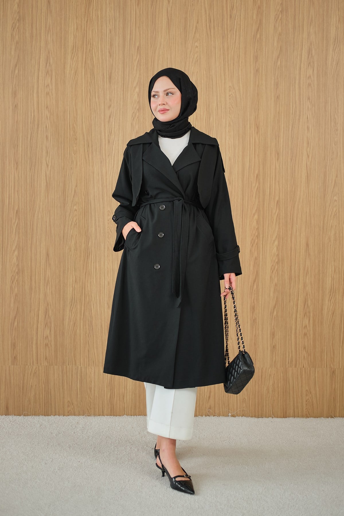 Kruvaze Yaka Bel Bağlamalı Çift Cepli Trenç Siyah