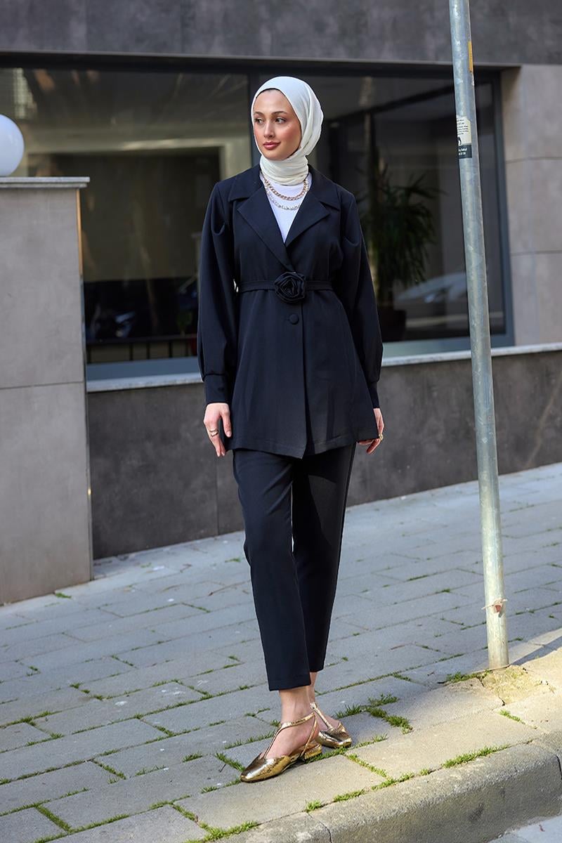 Kruvaze Yaka Gül Kemerli Takım Siyah