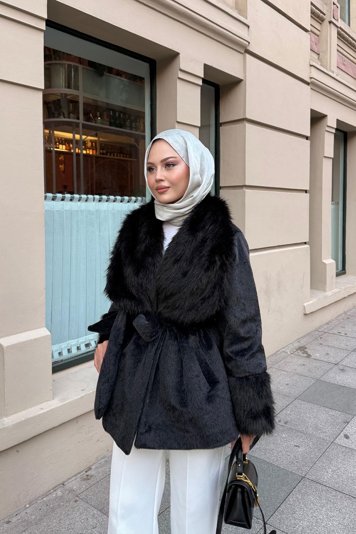 Kürk Detay Bel Bağlamalı Kısa Kaban Siyah