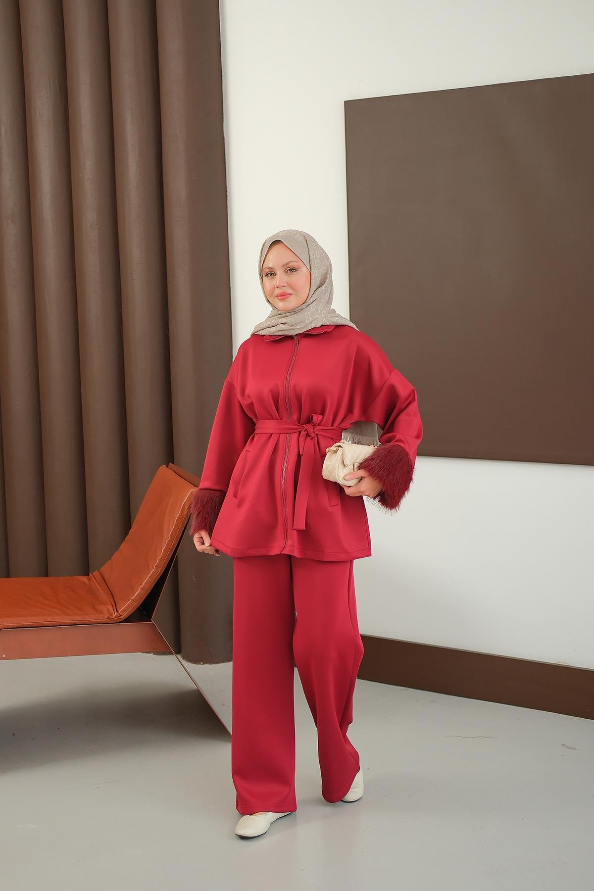 Kürk Detay Bel Bağlamalı Takım Bordo