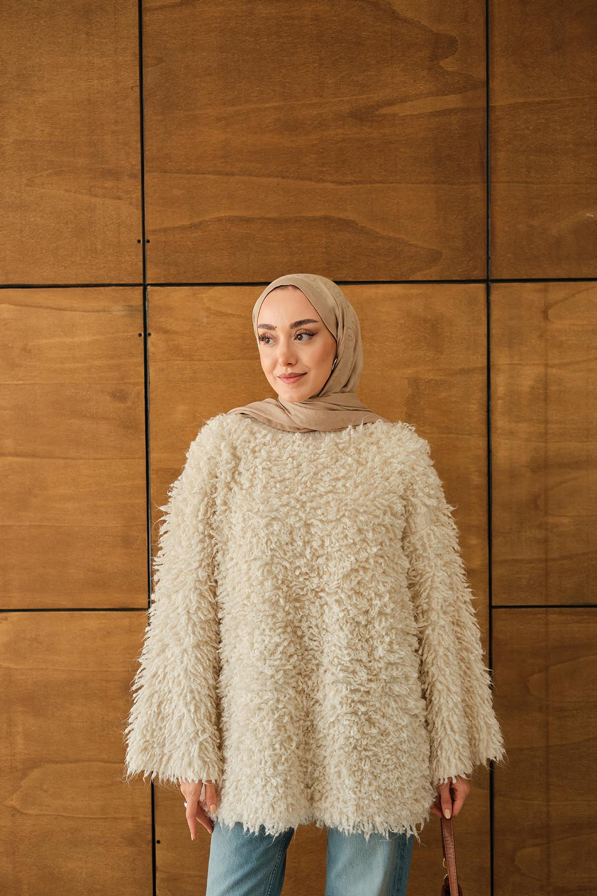 Kürk Detay Kazak Krem