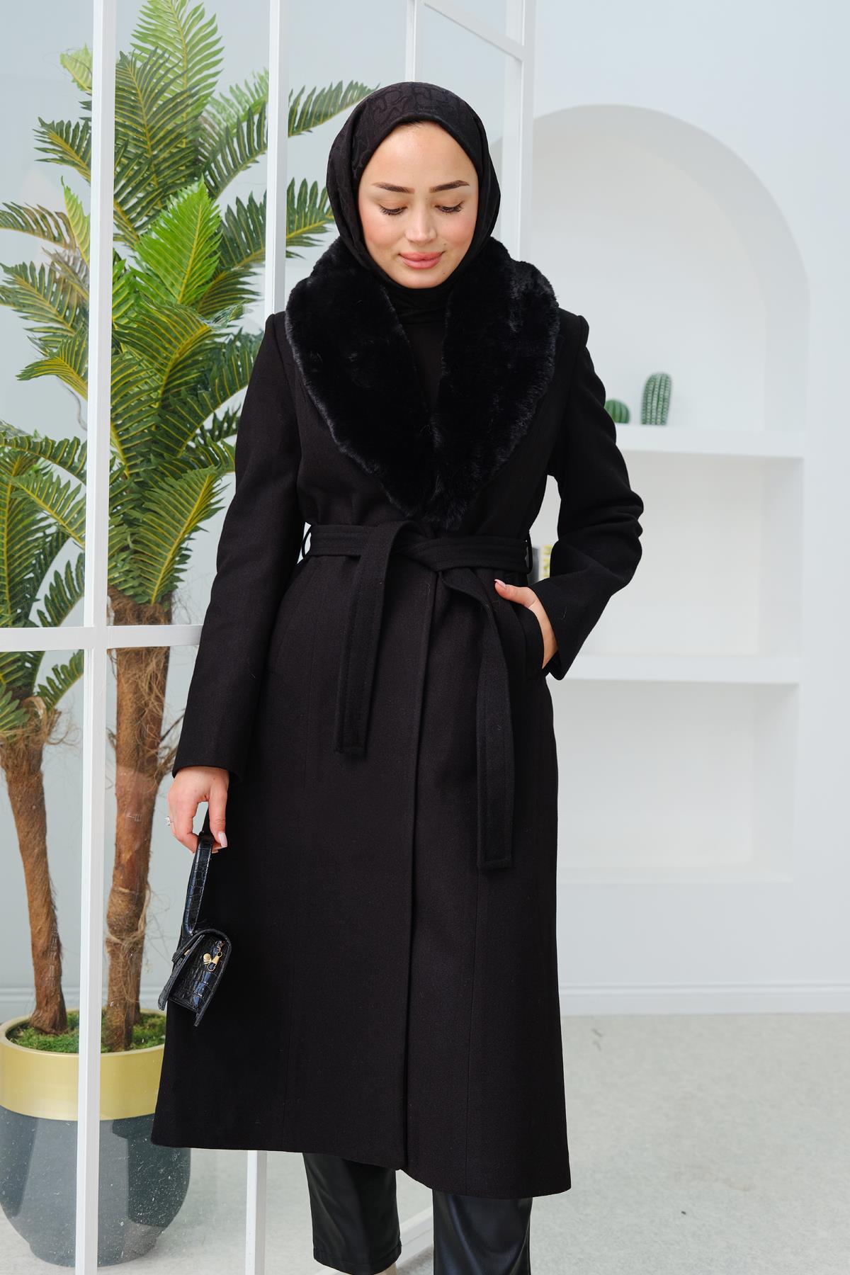 Kürk Yaka Detay Midi Boy Kruvaze Kaban Siyah