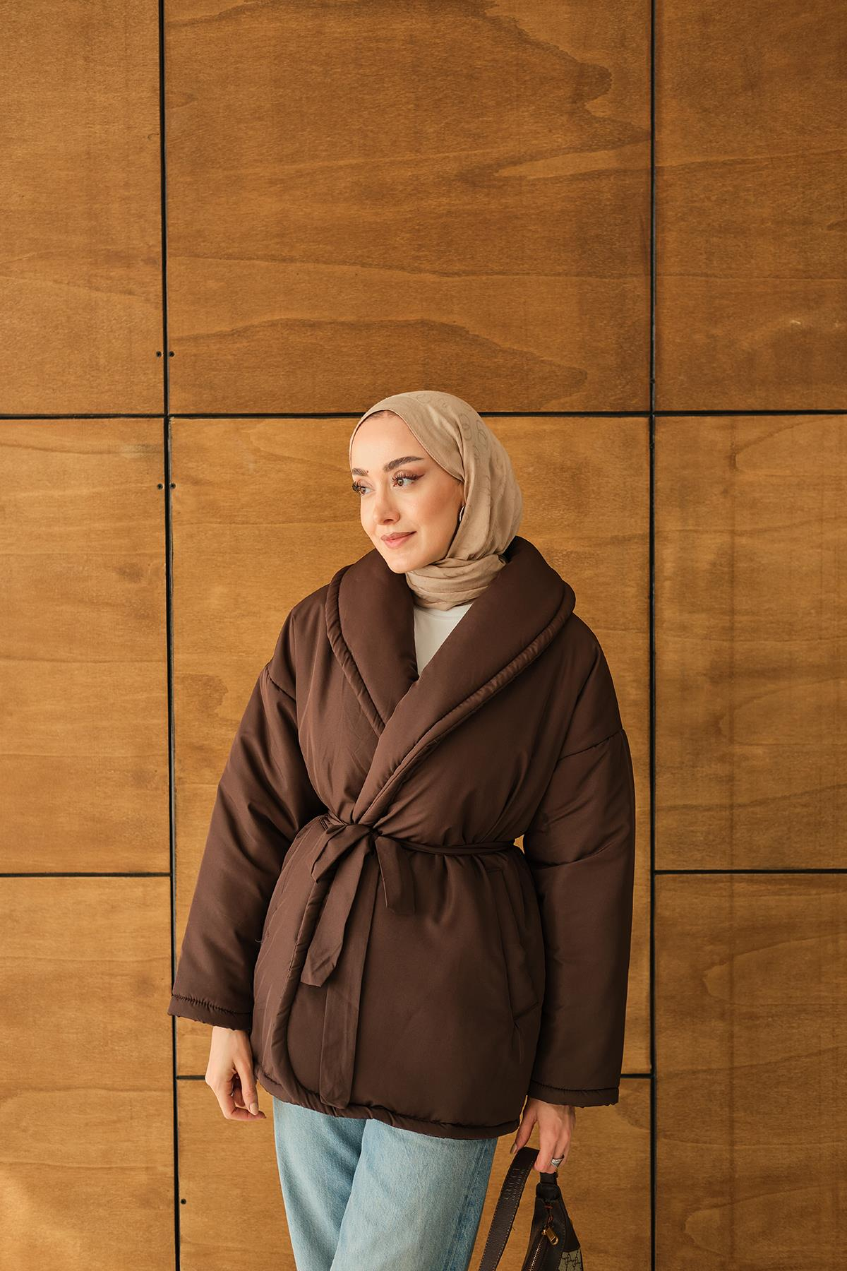Kuşaklı Şişme Mont Kahverengi