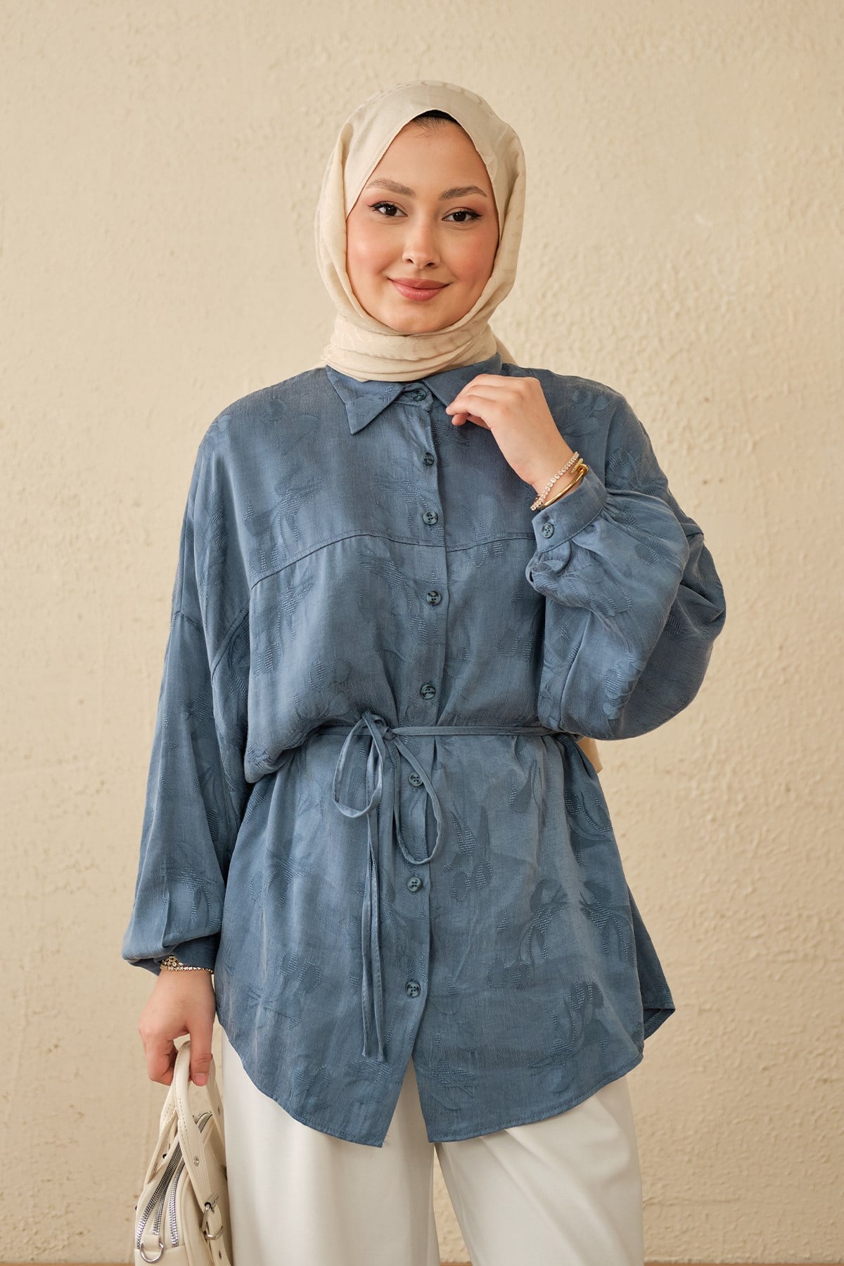 Lale Desen Saten Bel Bağlamalı Gömlek Mavi