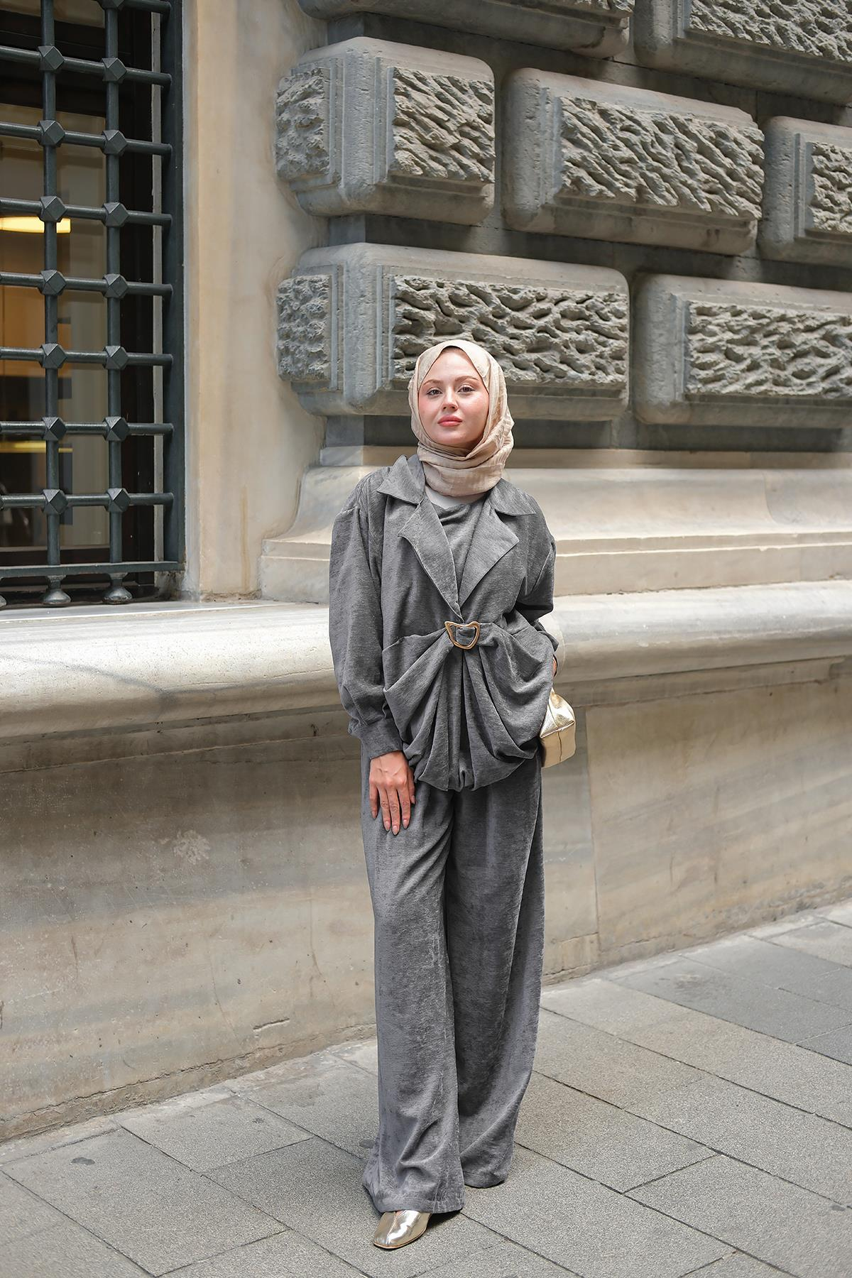Musleya Önü Pile Detay Süet Takım Antrasit