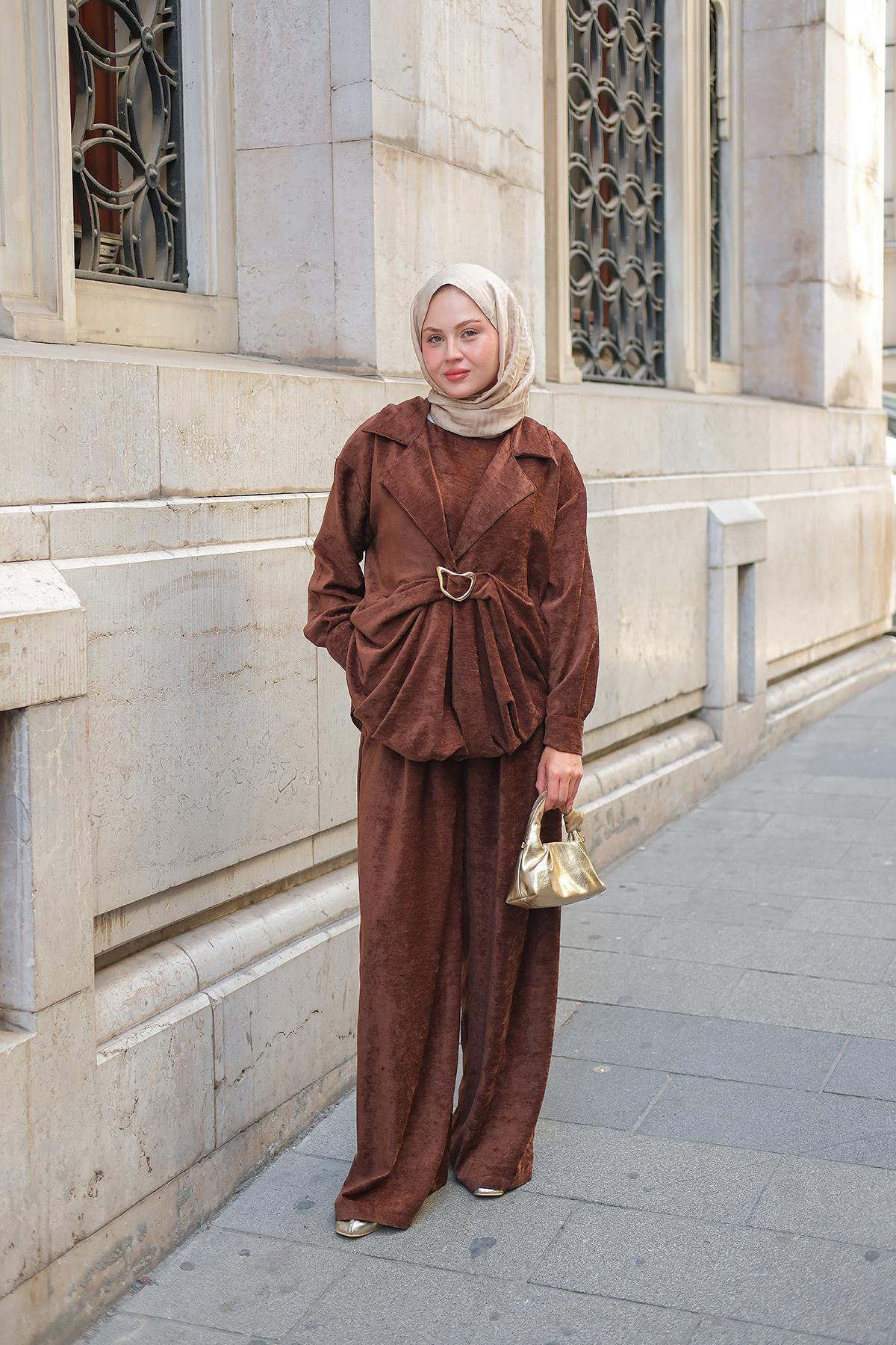 Musleya Önü Pile Detay Süet Takım Kahverengi