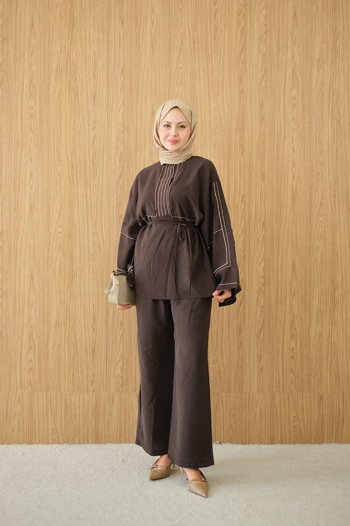 Nakış Detay Bel Bağlamalı Takım Kahverengi