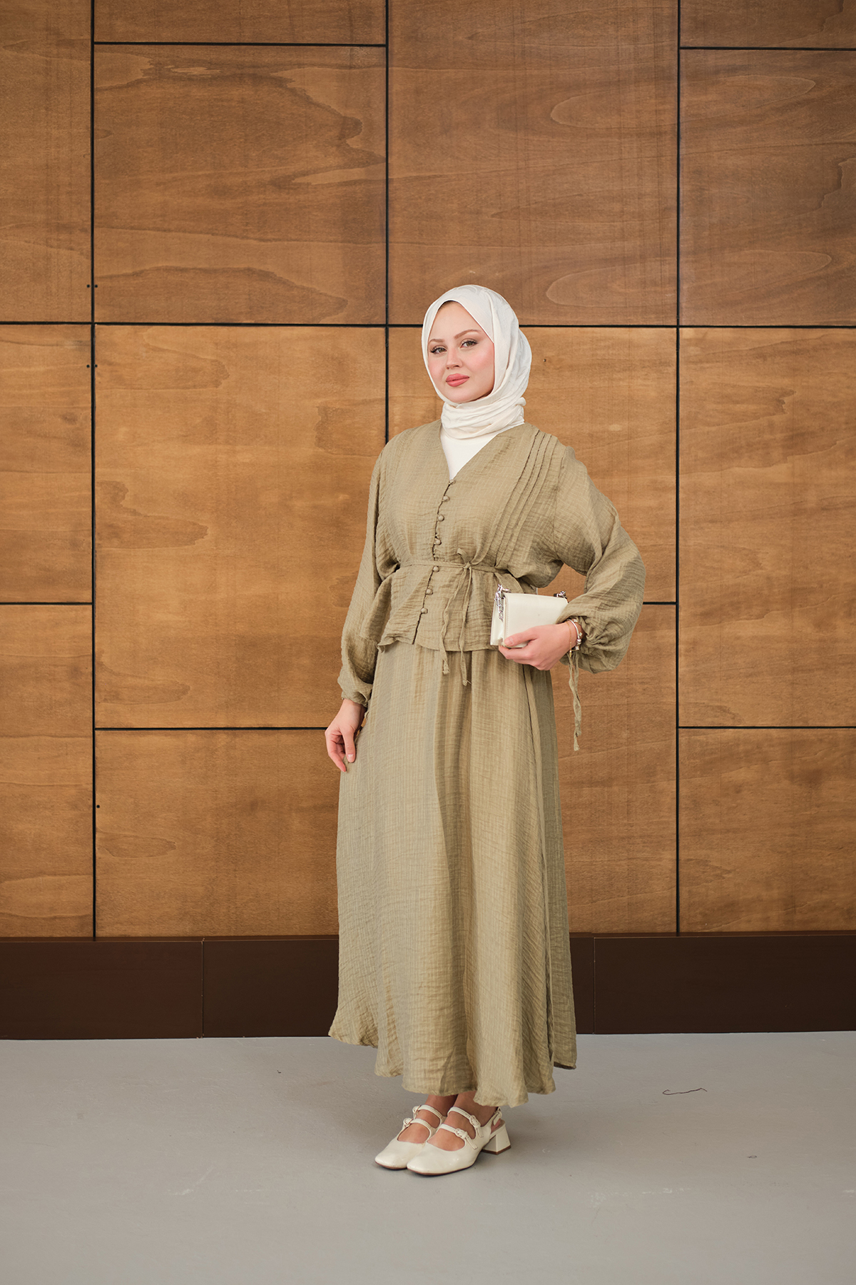 Nervür Detaylı Kendinden Desenli Etekli Takım Yağ Yeşil