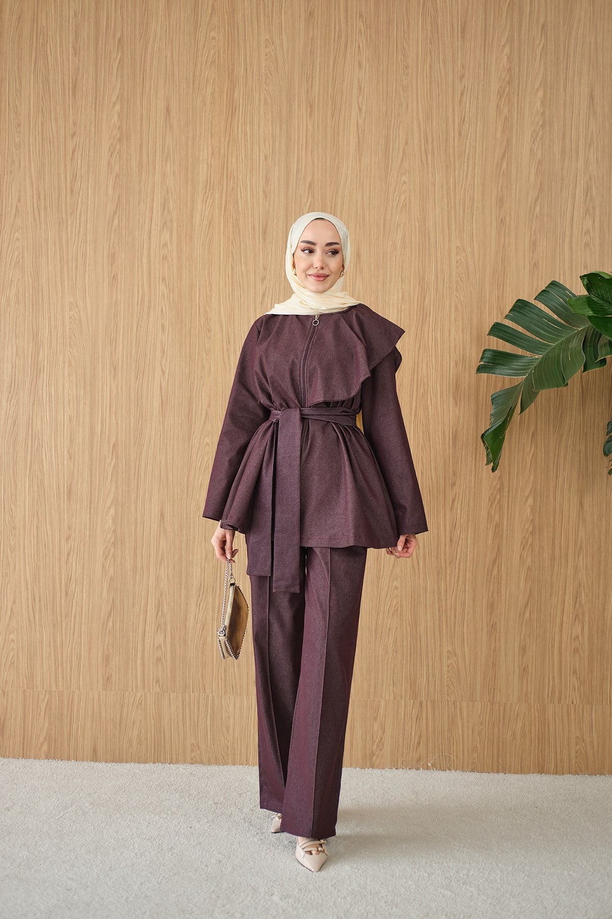 Omuz Büzgü Detaylı Fermuarlı Bel Bağlamalı Takım Bordo