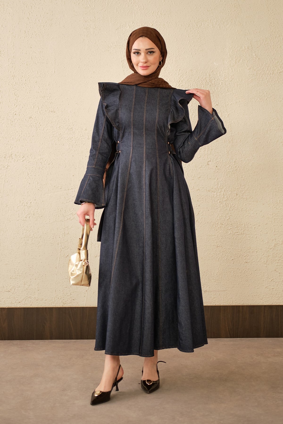 Omuz Büzgülü Dikiş Detay Bel Bağlamalı Kot Elbise Lacivert