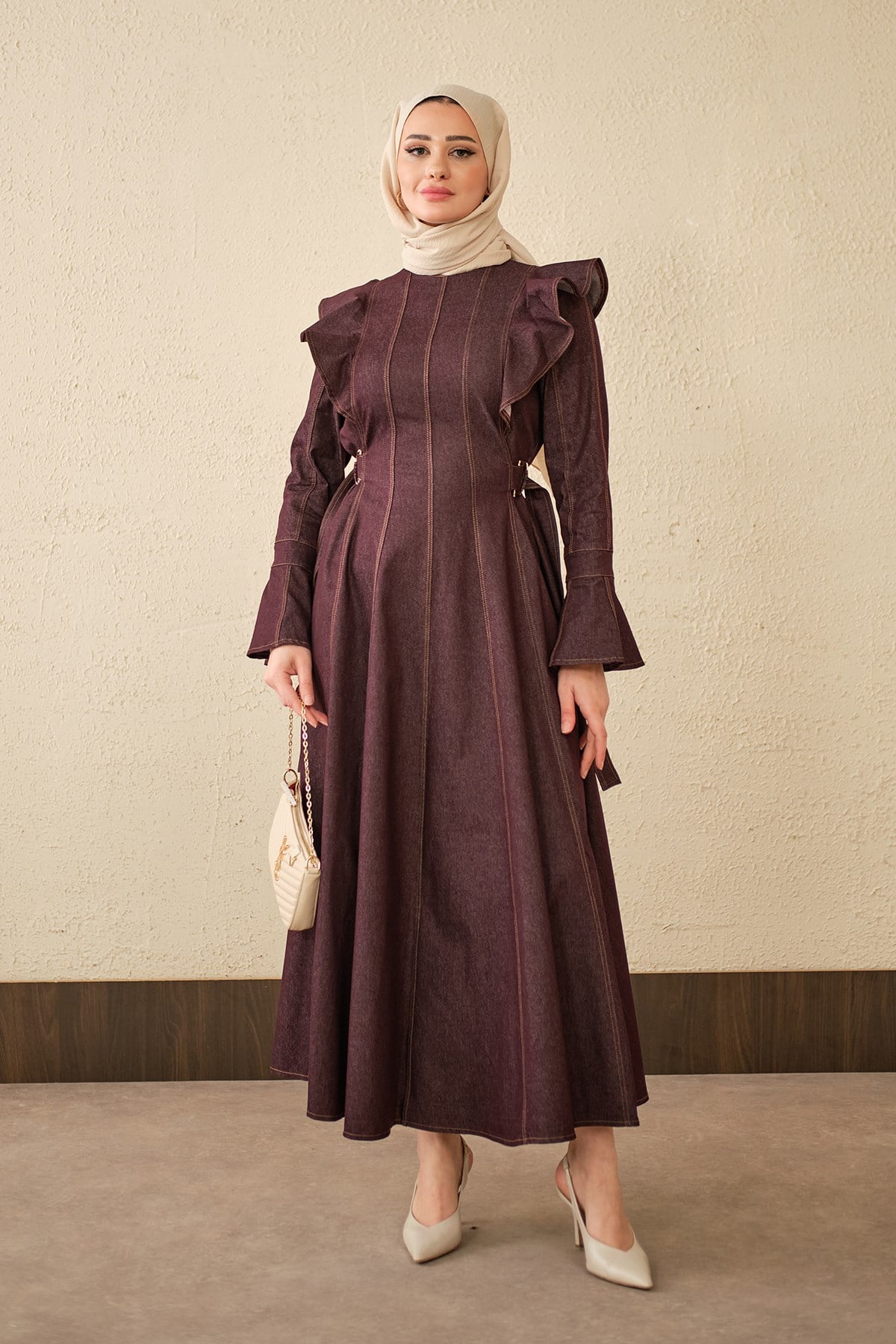 Omuz Büzgülü Dikiş Detay Bel Bağlamalı Kot Elbise Mürdüm