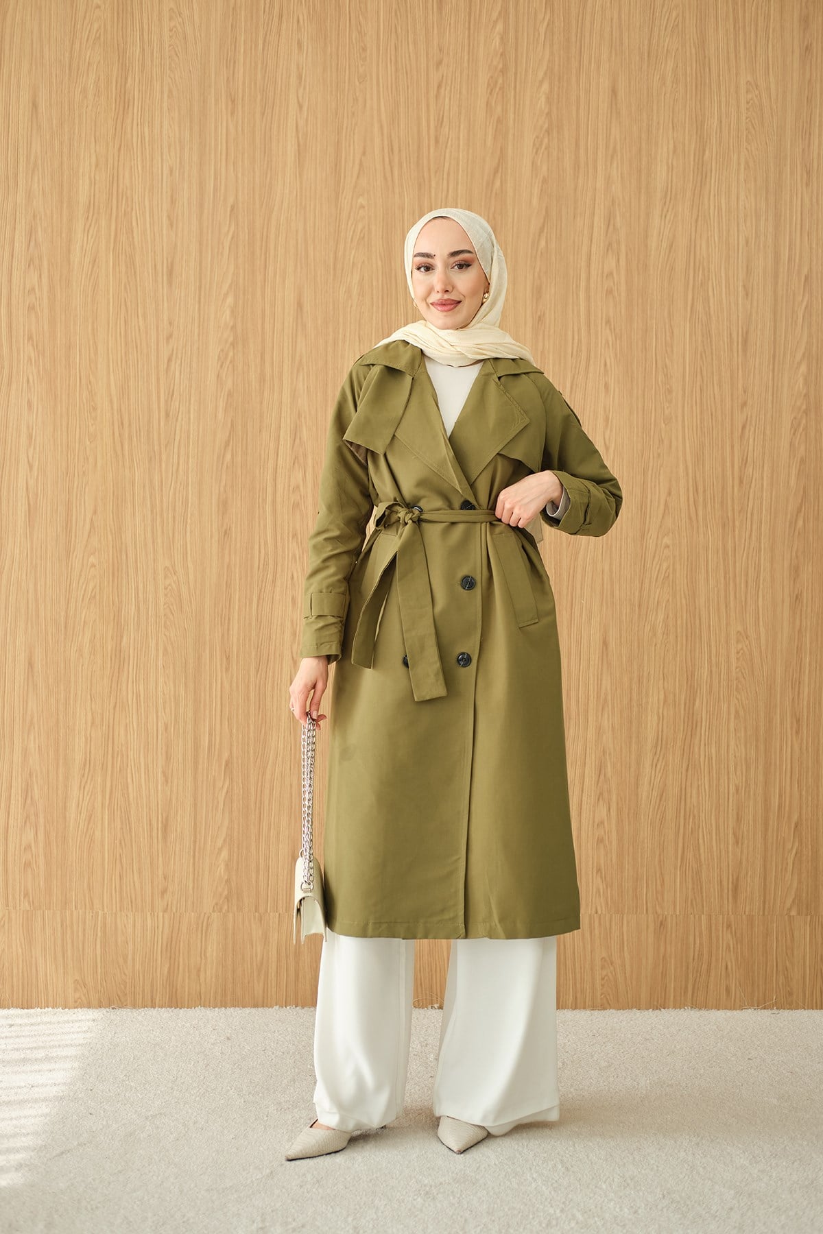 Omuz Düğme Detay Kruvaze Yaka Midi Boy Trenç Haki Yeşil