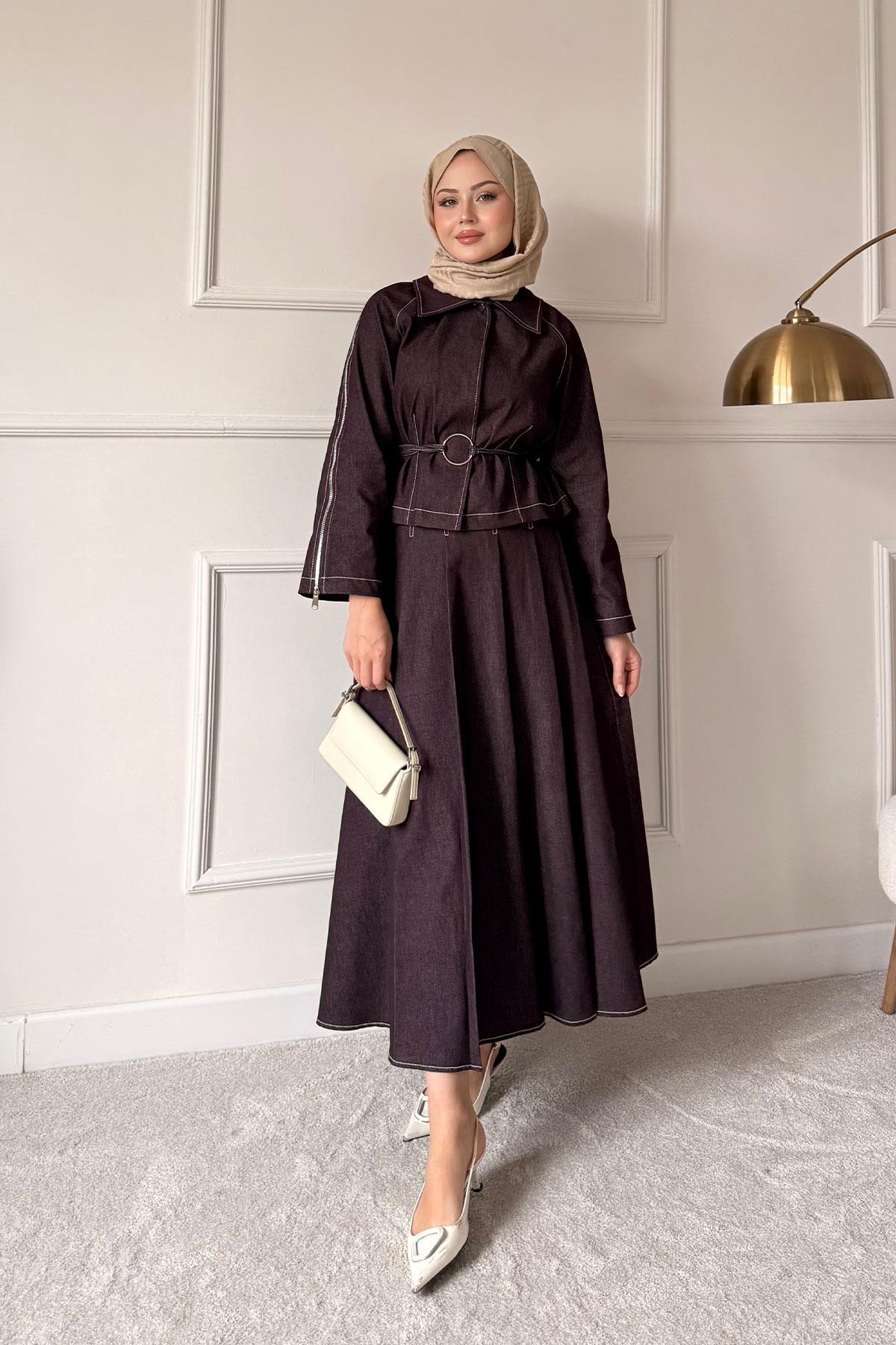 Omuz Fermuar Detay Bel Bağlamalı Etekli Kot Takım Mürdüm