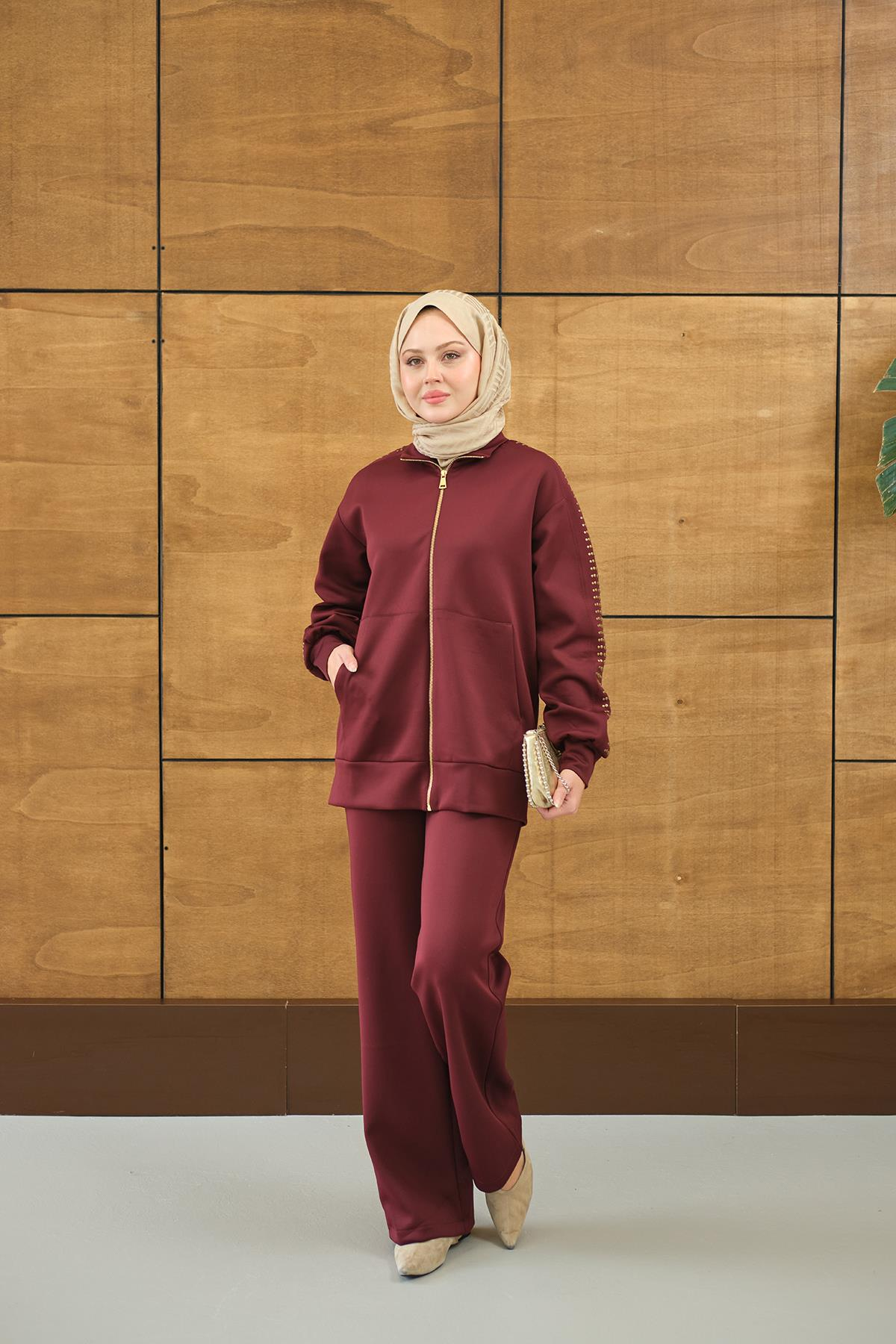 Omuz Gold Drop Detay Önü Cepli Fermuar Detay Takım Bordo