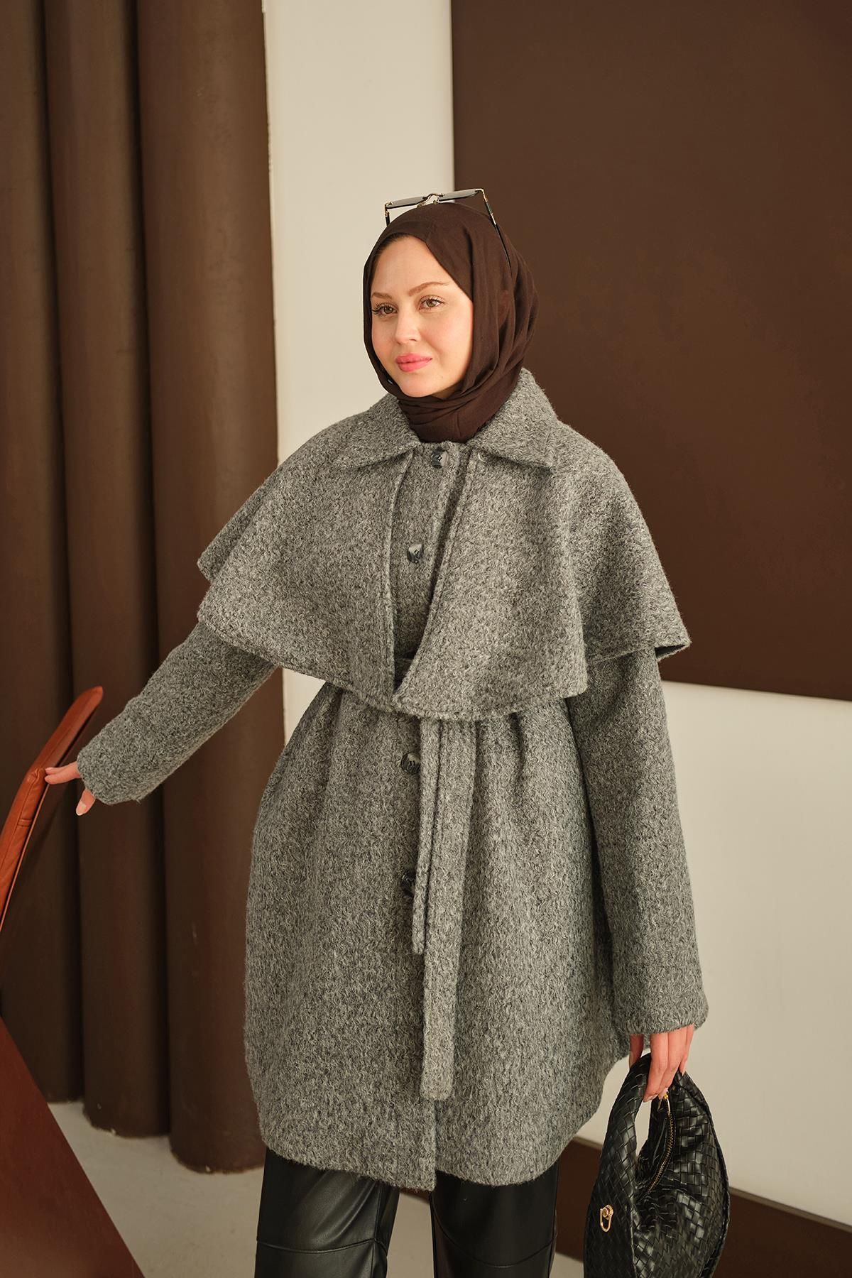 Omuz Pelerinli Peluş Kaşe Kaban Gri