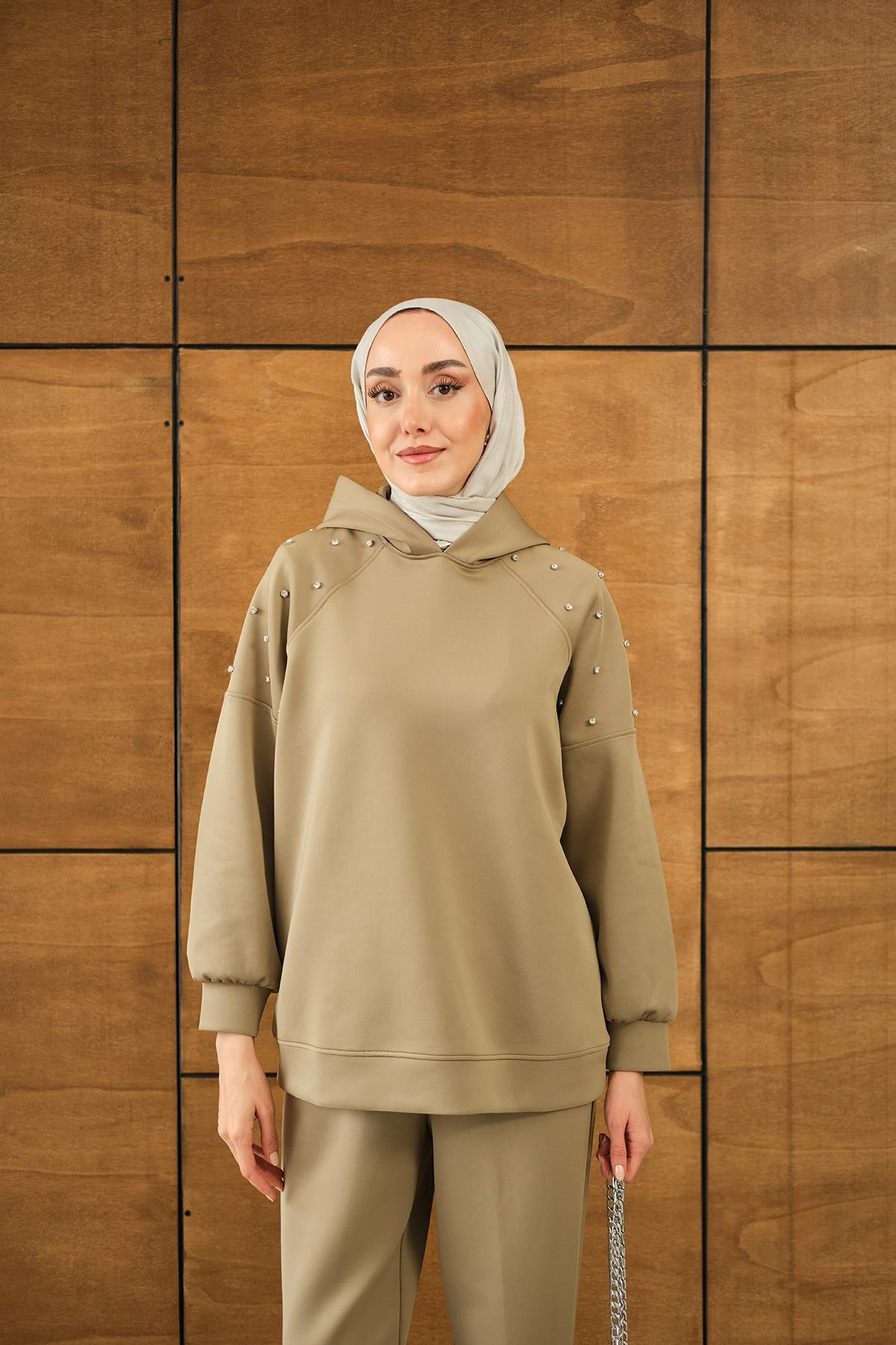Omuz Taş Detay Kapüşonlu Takım Yeşil