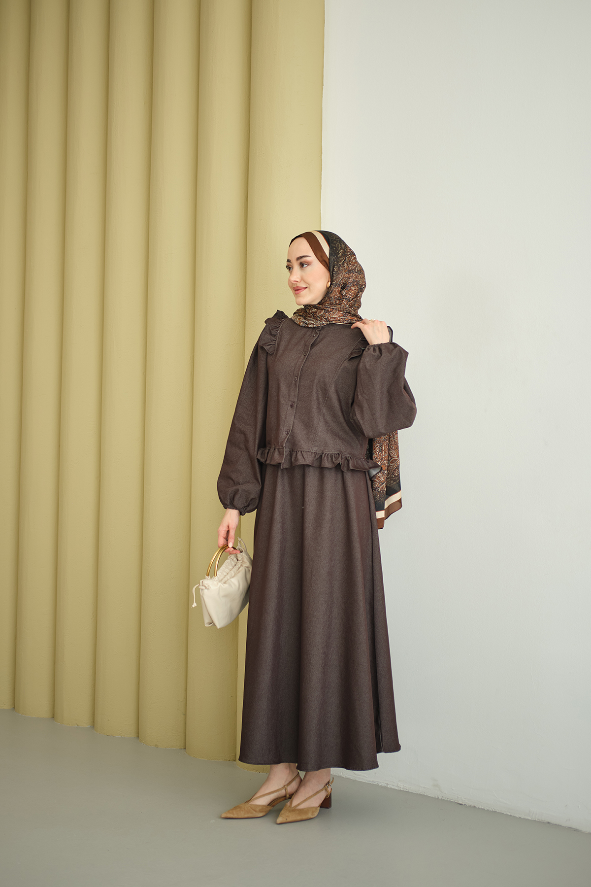 Omuzları Ve Beli Fırfır Detaylı Etekli Takım Kahverengi