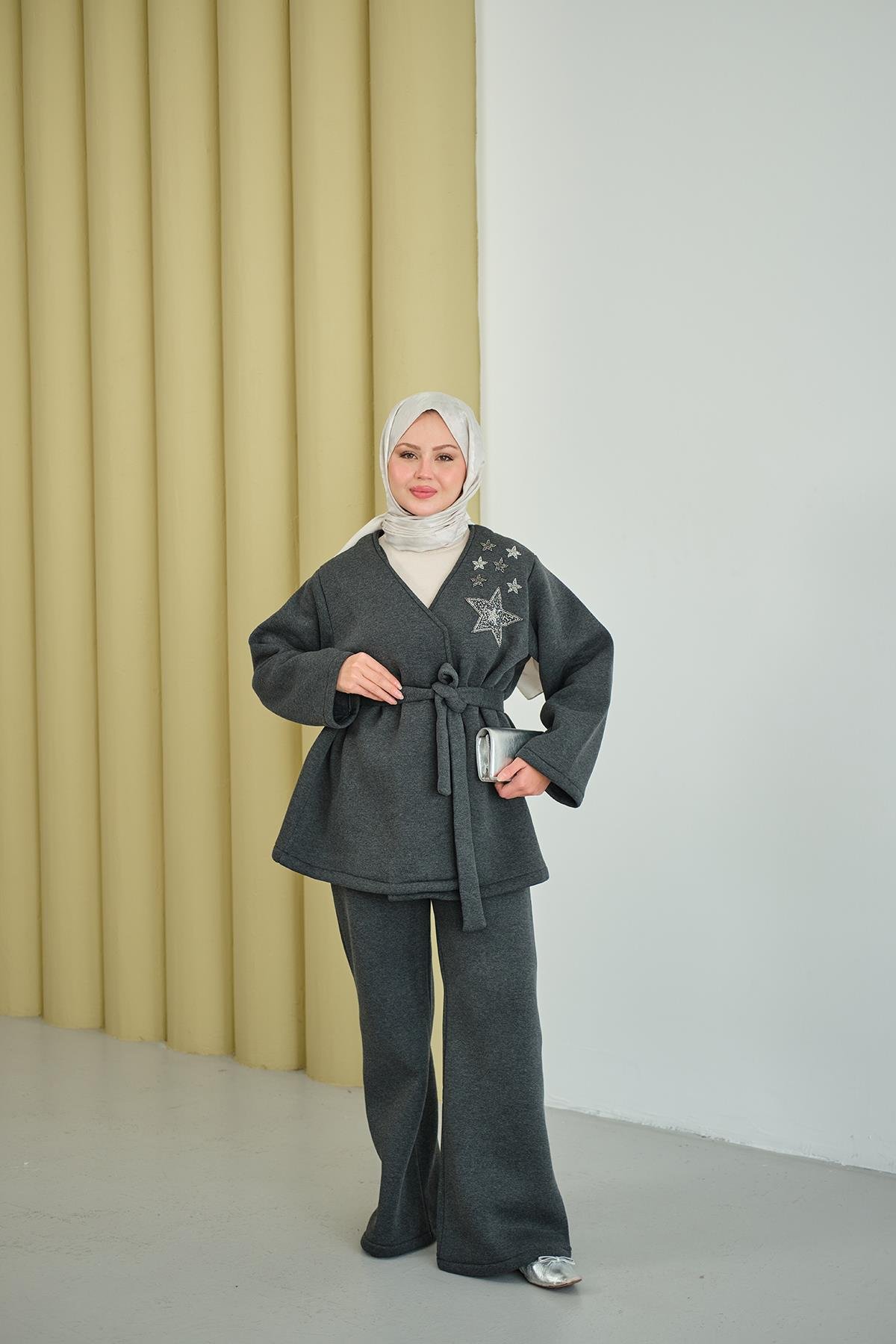 Omzu Yıldız Detaylı Bel Bağlamalı Takım Füme