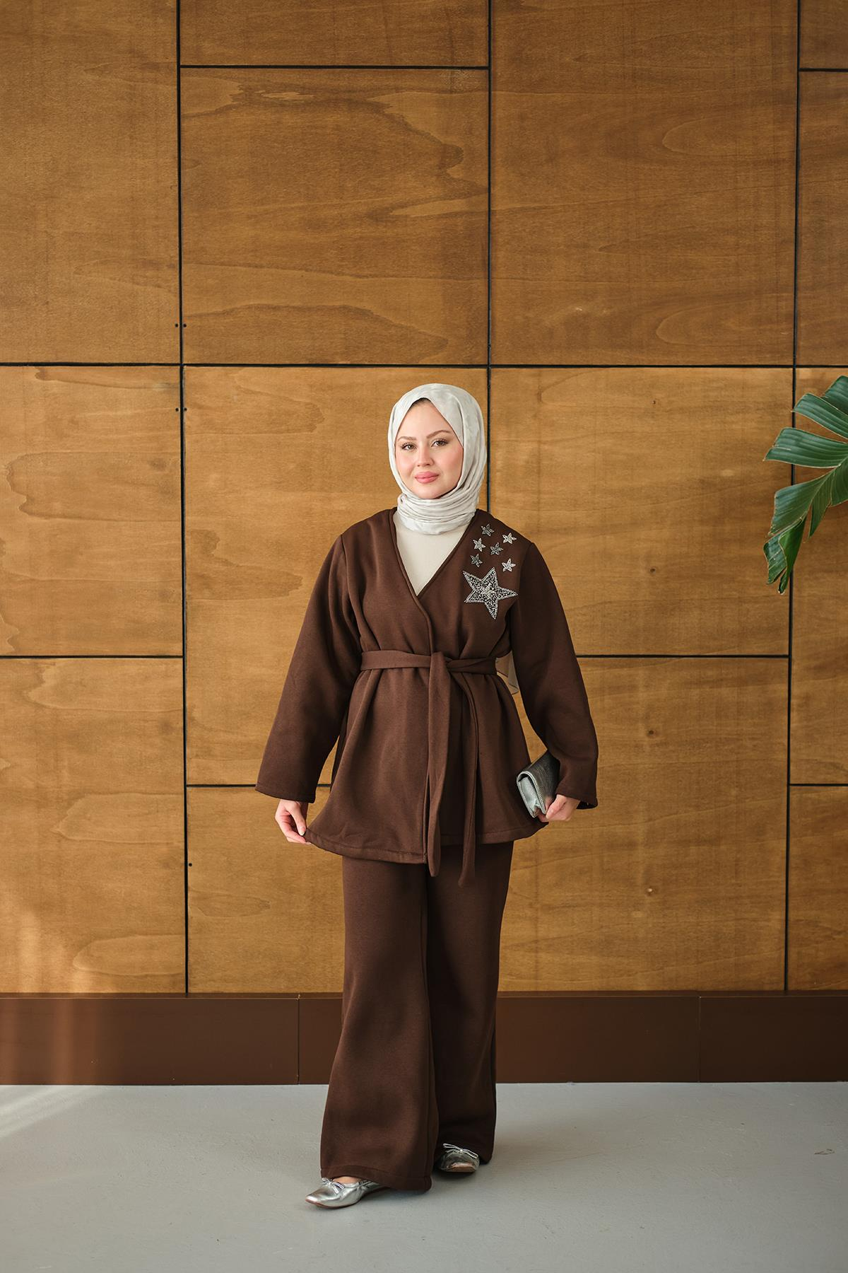 Omzu Yıldız Detaylı Bel Bağlamalı Takım Kahverengi