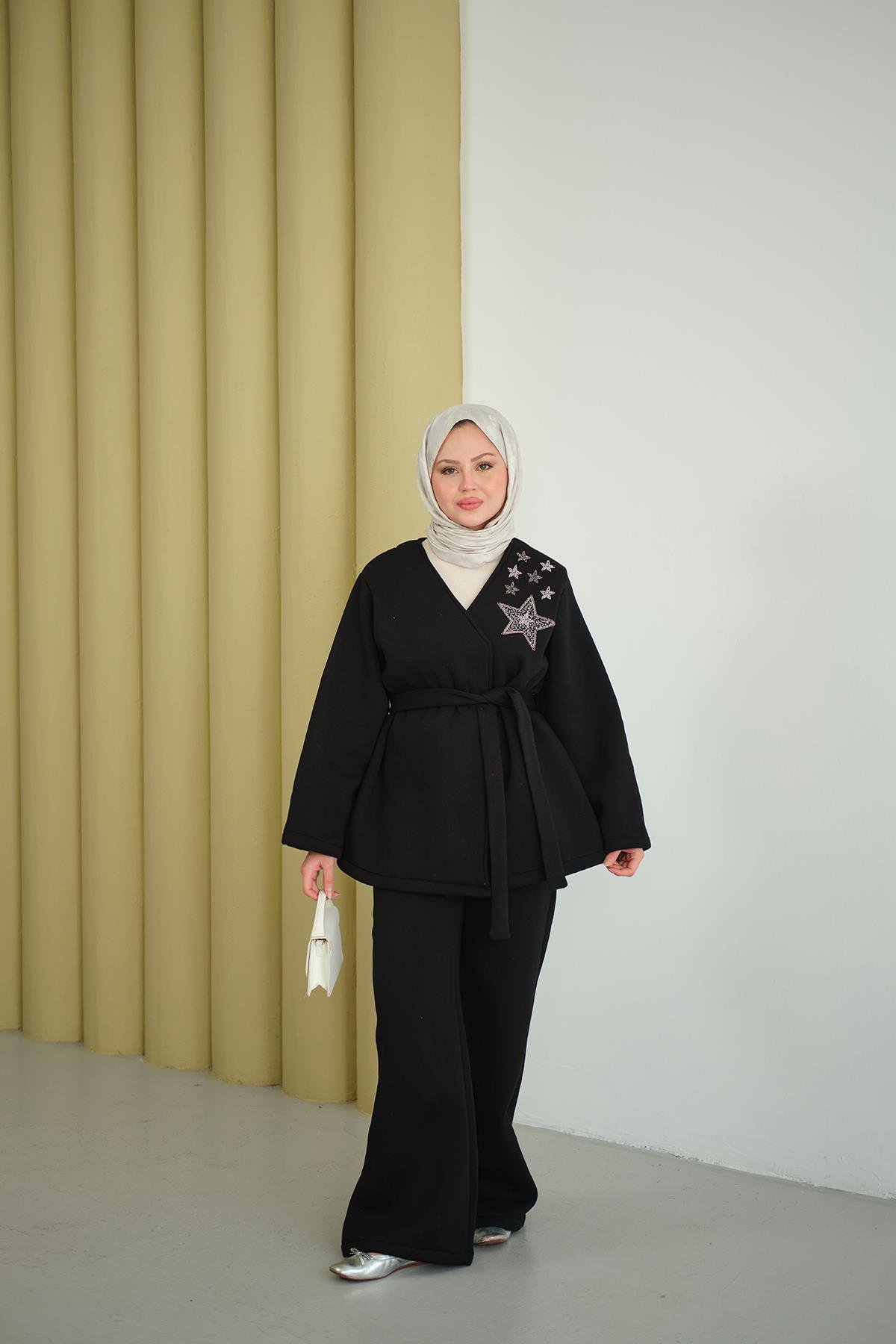 Omzu Yıldız Detaylı Bel Bağlamalı Takım Siyah
