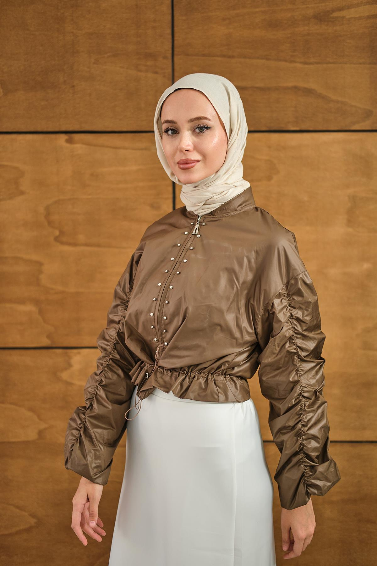 Ön Boncuk Detay Kısa Yağmurluk Kahverengi