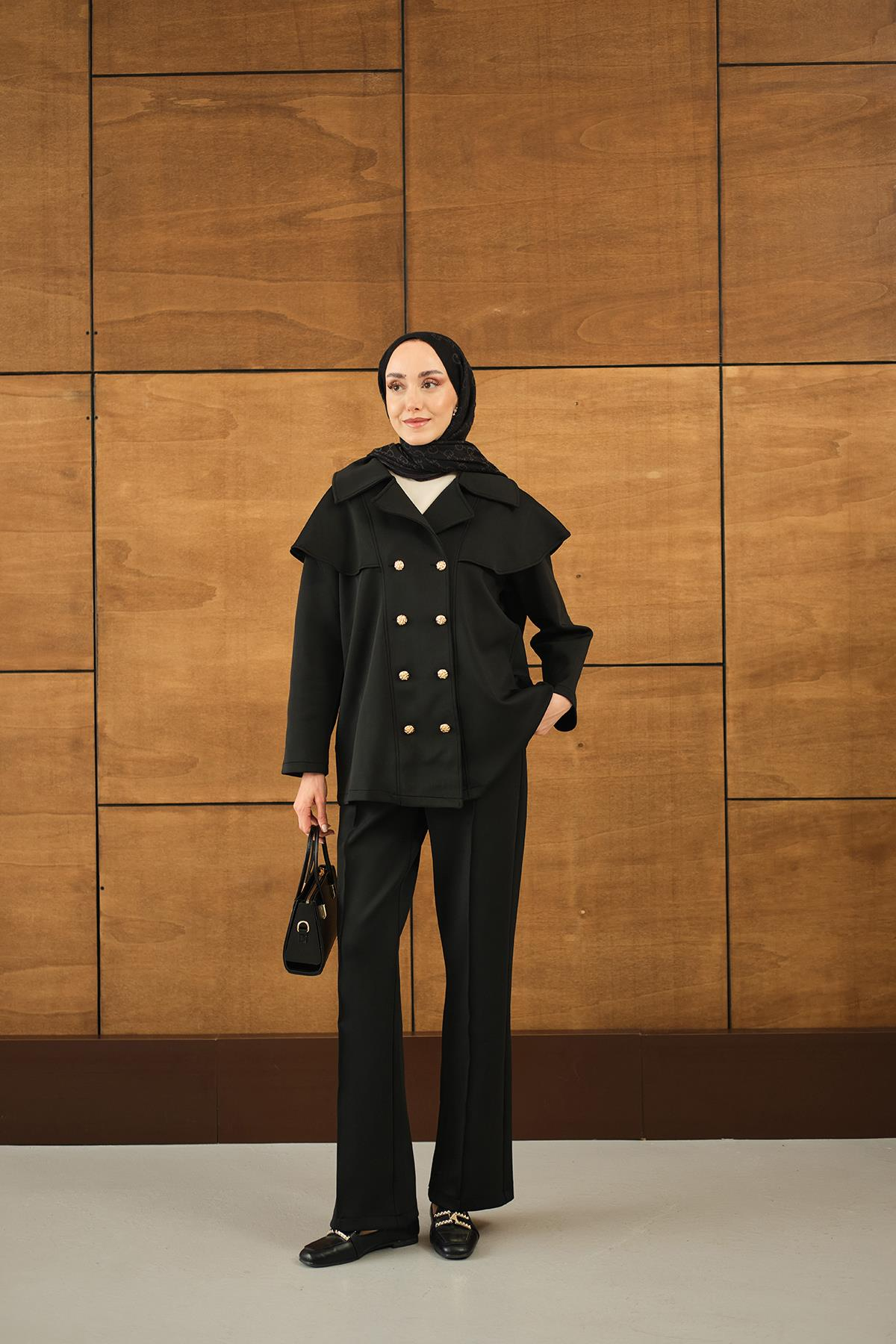 Ön Düğme Ve Biye Detaylı İkili Takım Siyah