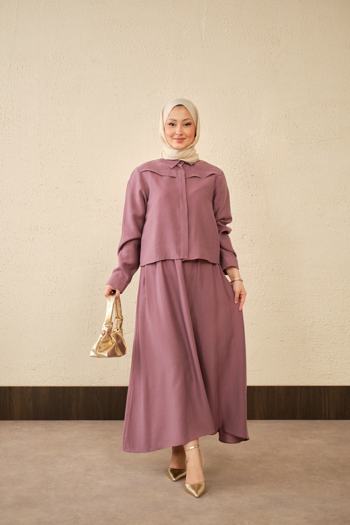 Ön Gizli Düğme Dtay Kısa Gömlek Takım Mürdüm