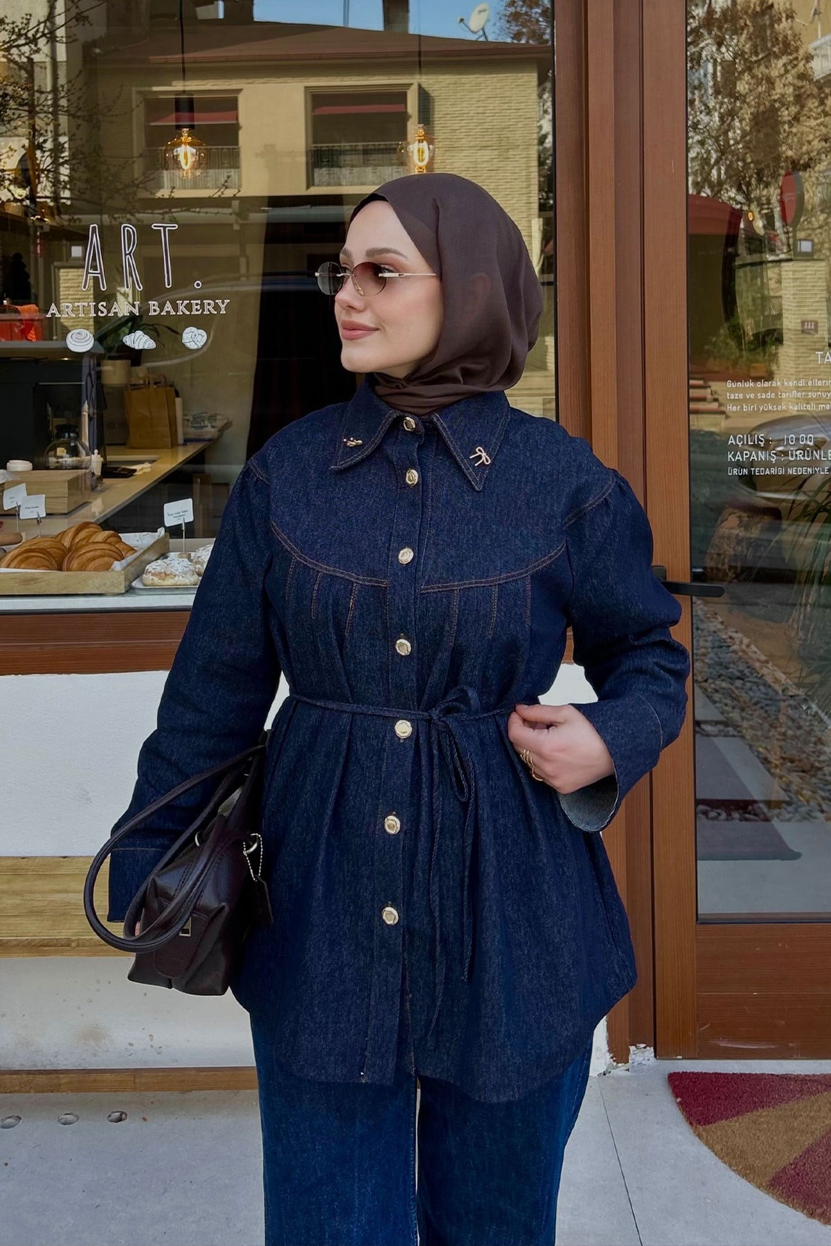 Ön Pileli Gold Düğme Detay Gömlek Lacivert