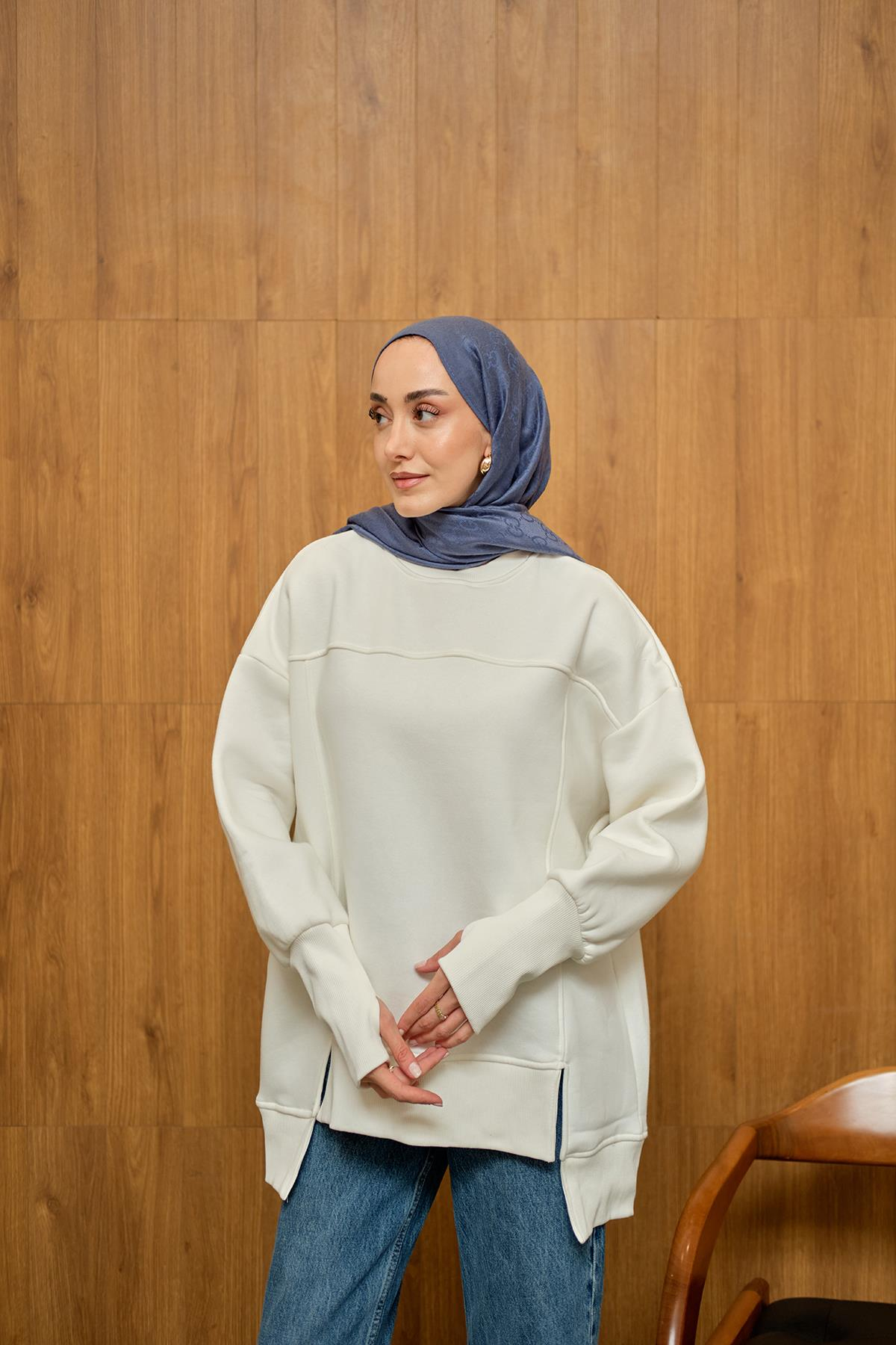 Ön Yırtmaç Ve Parmak Detaylı Sweat Beyaz