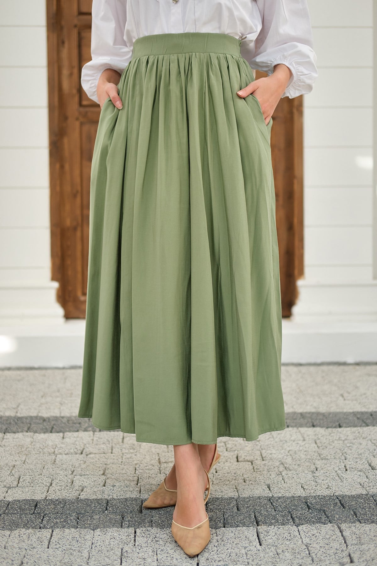 Önden Büzgülü Çift Cepli Etek Açık Yeşil
