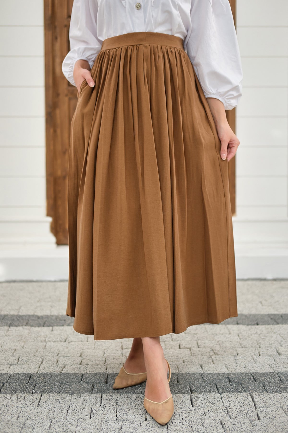 Önden Büzgülü Çift Cepli Etek Camel