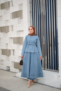 Önden Yırtmaçlı Beli Kemerli Takım Buz Mavi