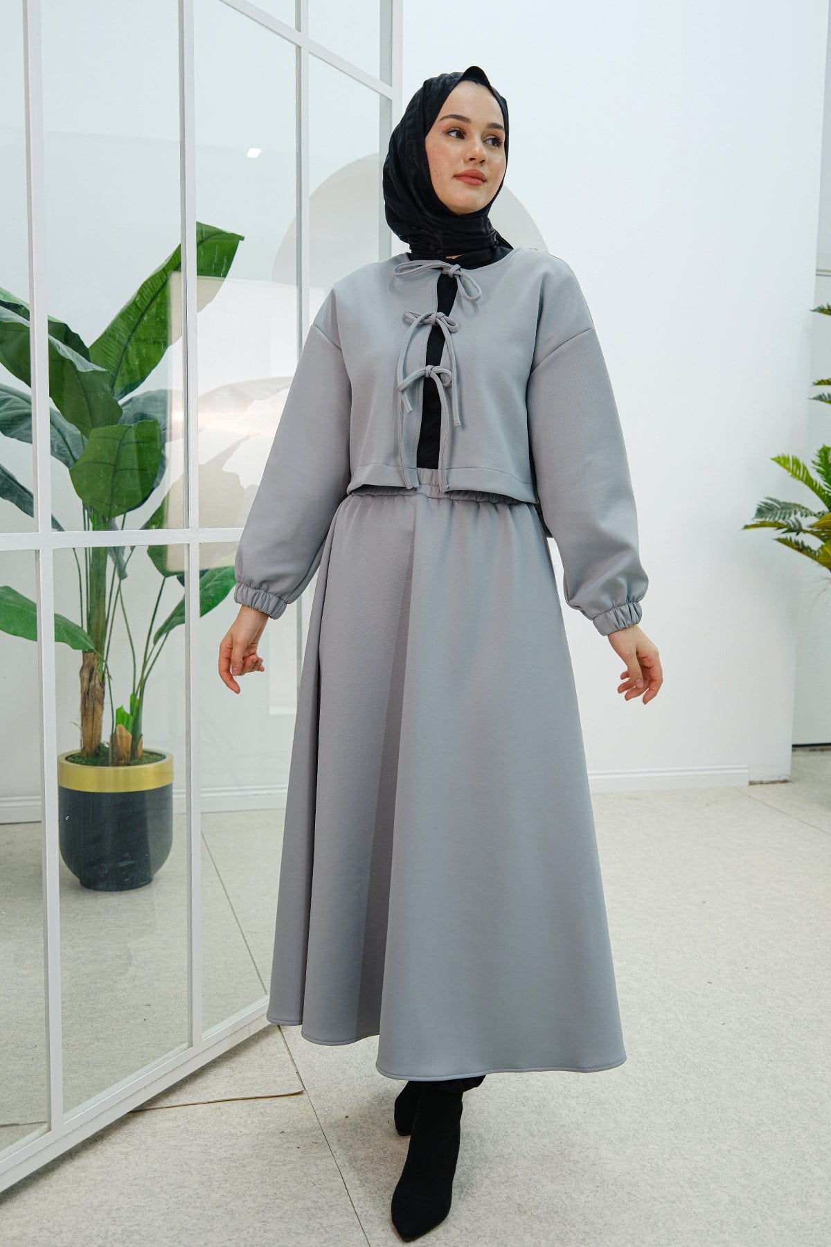 Önü Bağlamalı Etekli Takım Gri