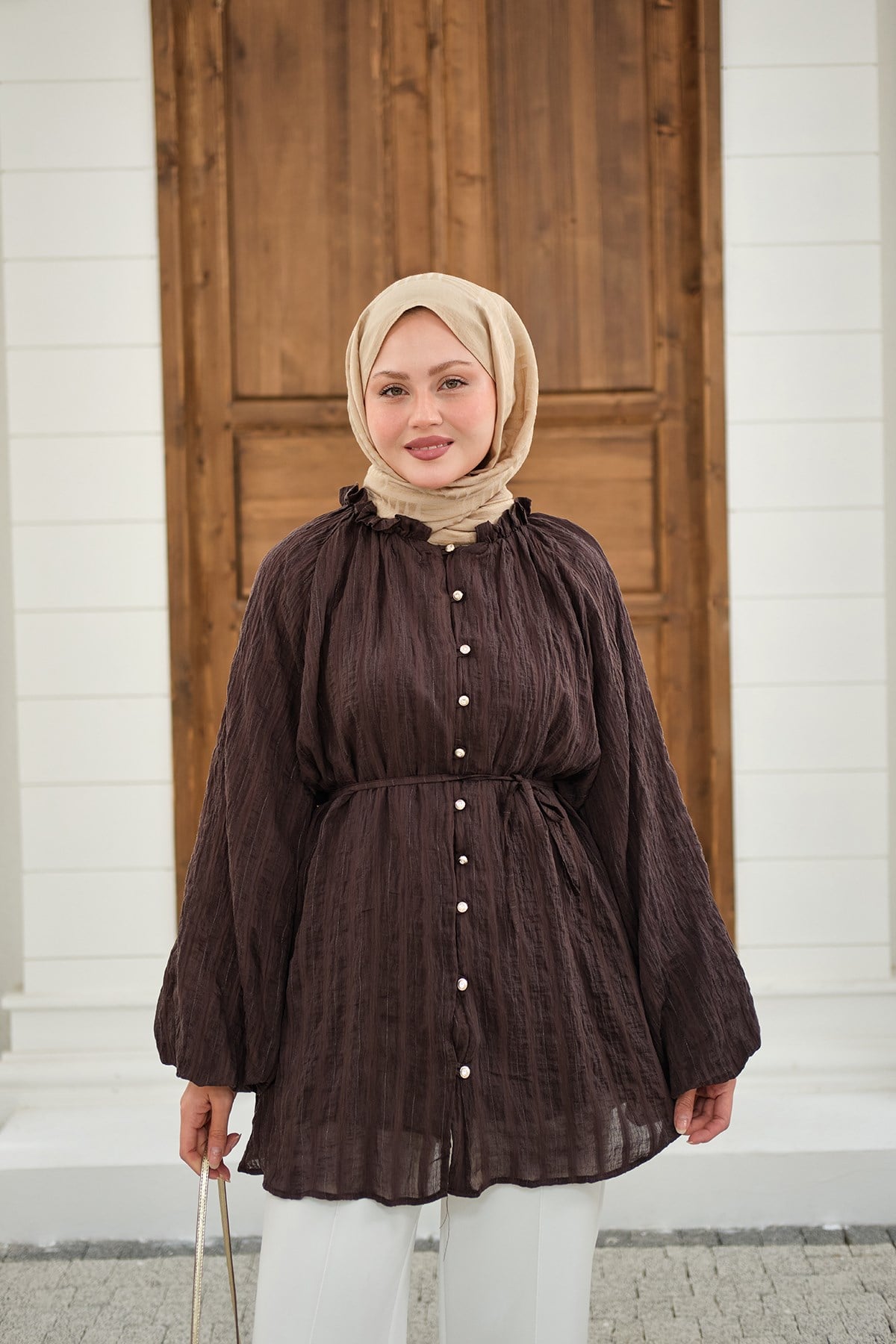 Önü Britli Simli Büzgülü Gömlek Kahverengi