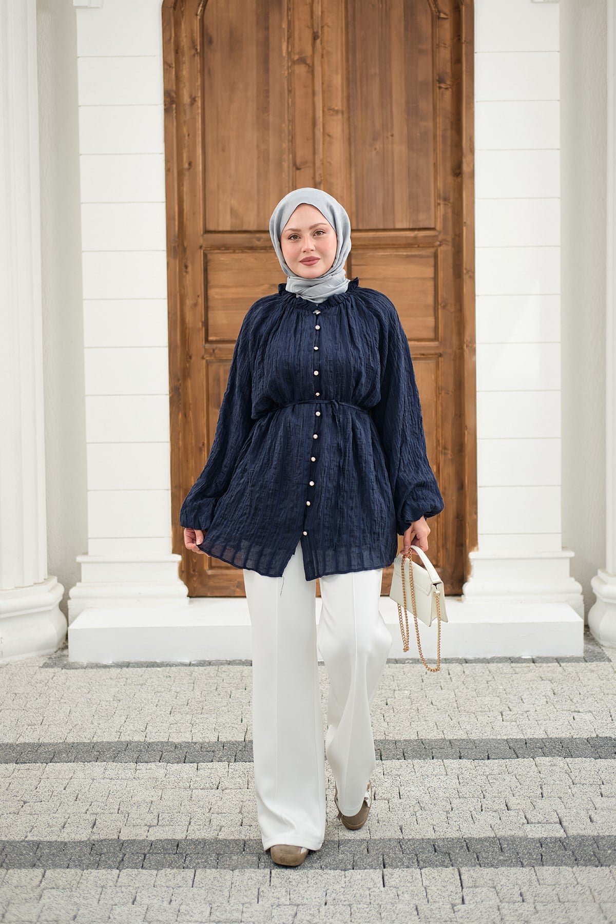 Önü Britli Simli Büzgülü Gömlek Lacivert