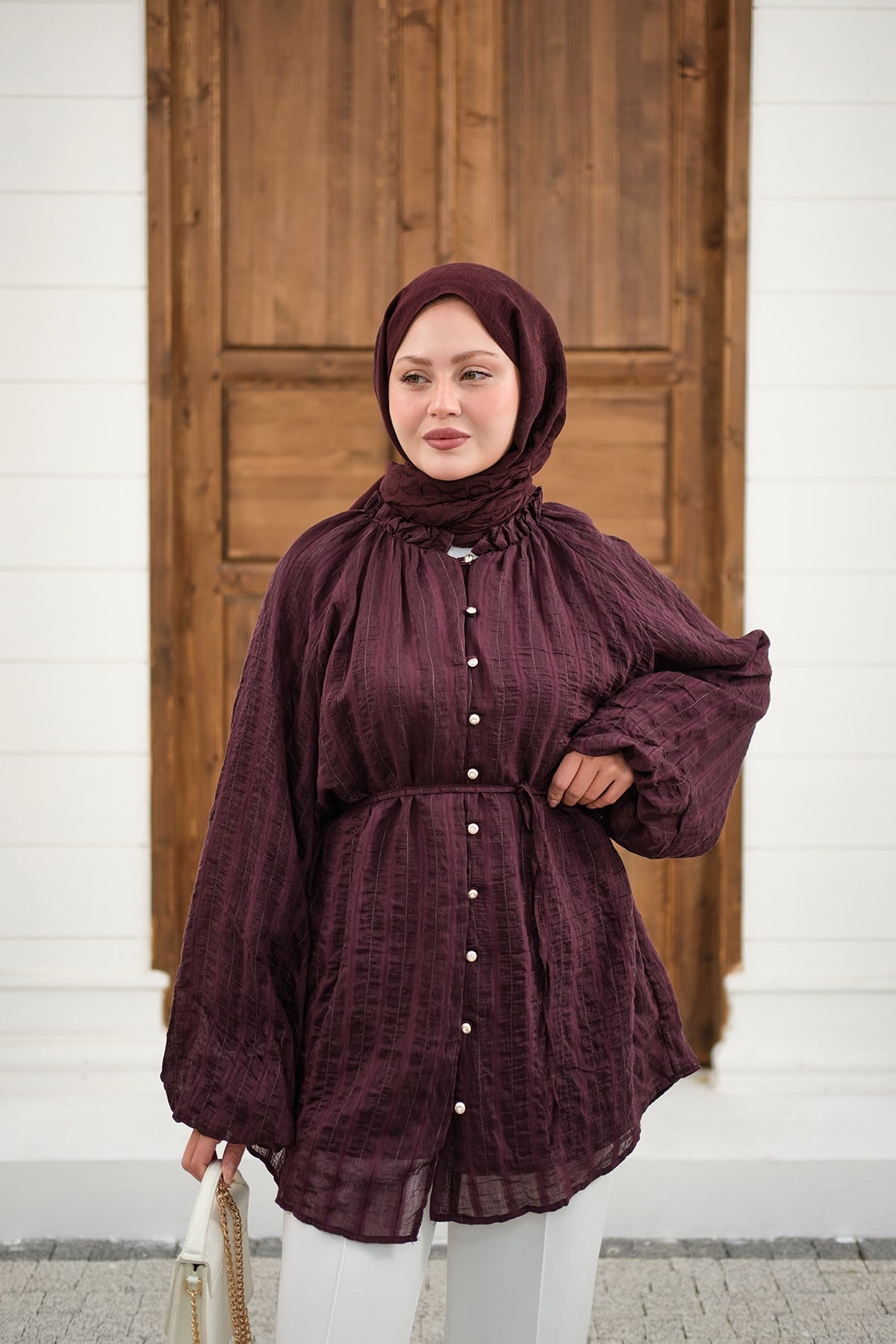 Önü Britli Simli Büzgülü Gömlek Mürdüm