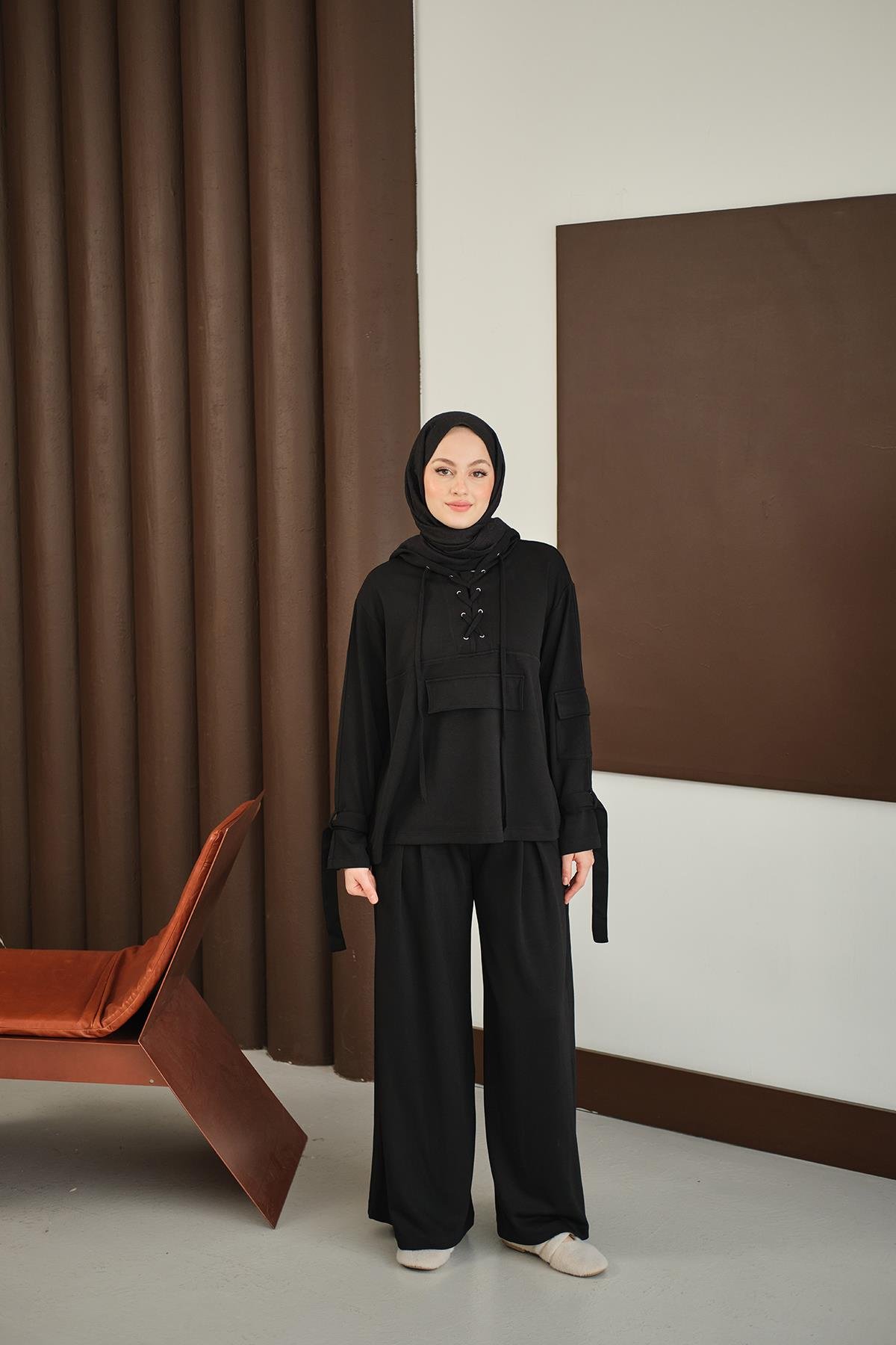 Önü Çapraz İp Detay Takım Siyah