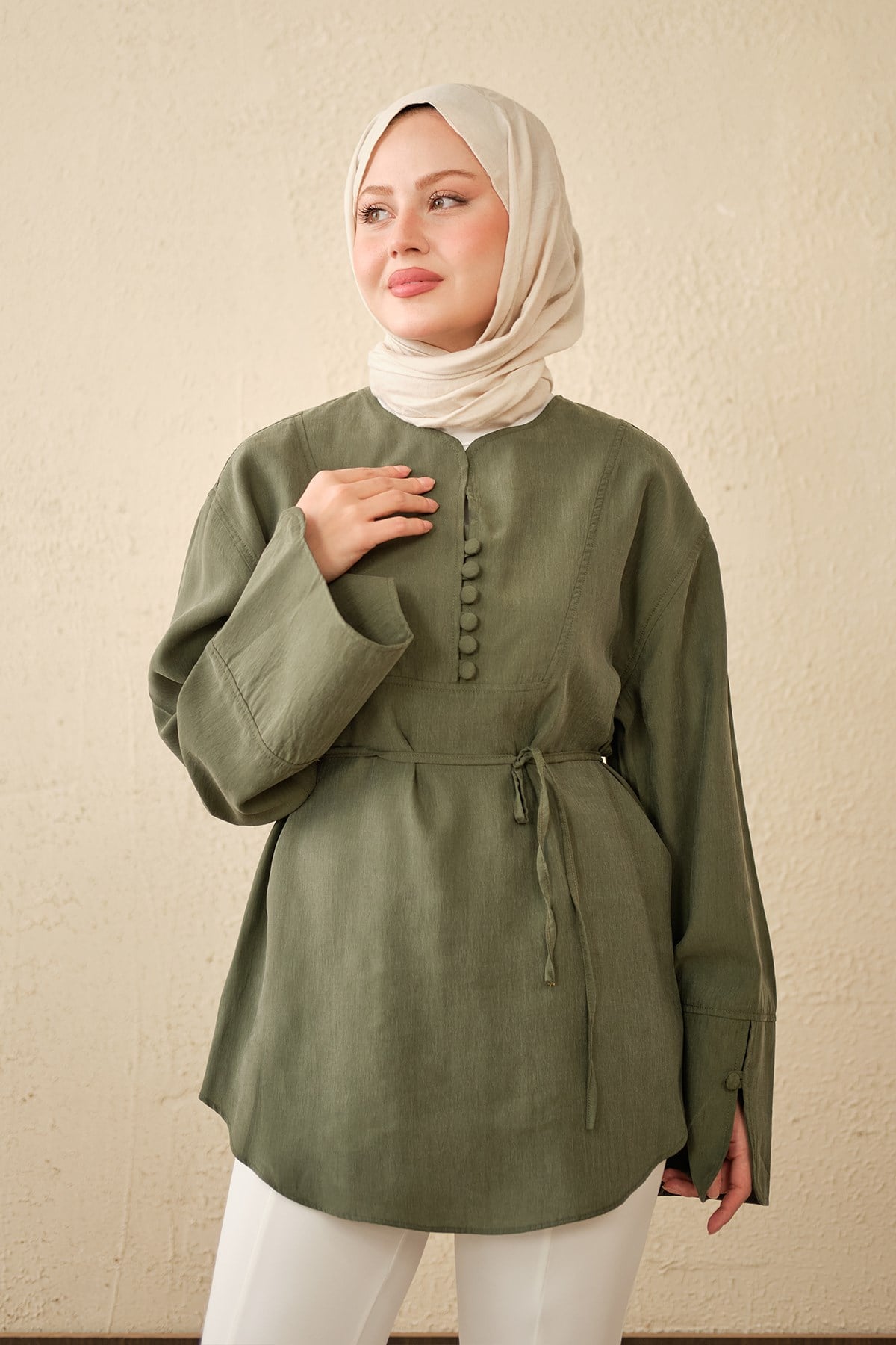 Önü Çoban Düğmeli Bel Bağlamalı Tunik Haki Yeşil