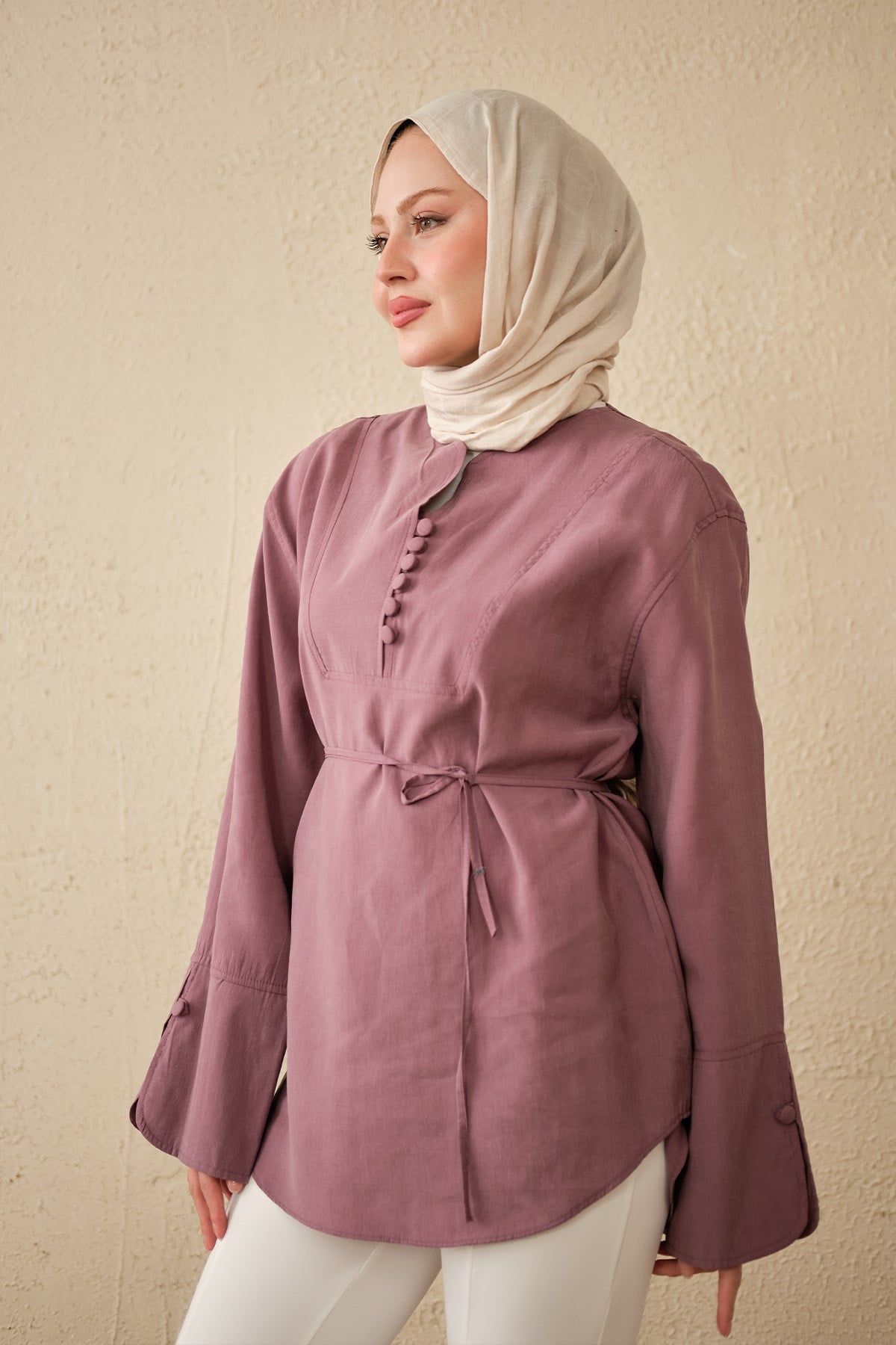 Önü Çoban Düğmeli Bel Bağlamalı Tunik Mürdüm