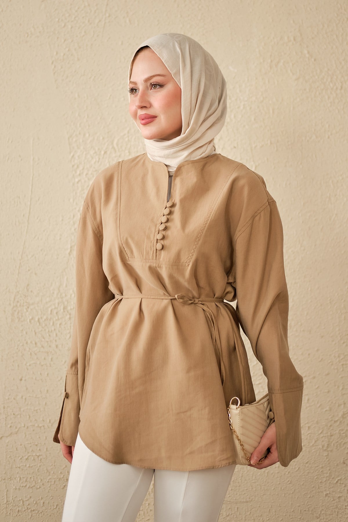 Önü Çoban Düğmeli Bel Bağlamalı Tunik Vizon