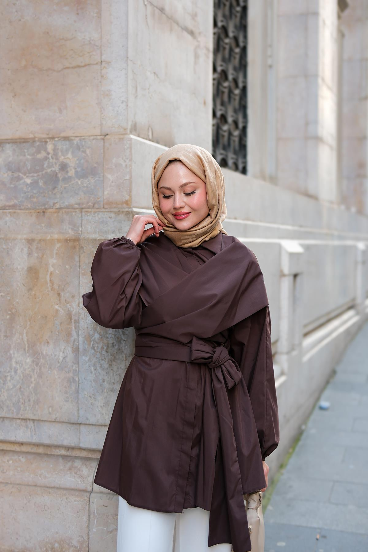 Önü Drape Detay Poplin Gömlek Kahverengi