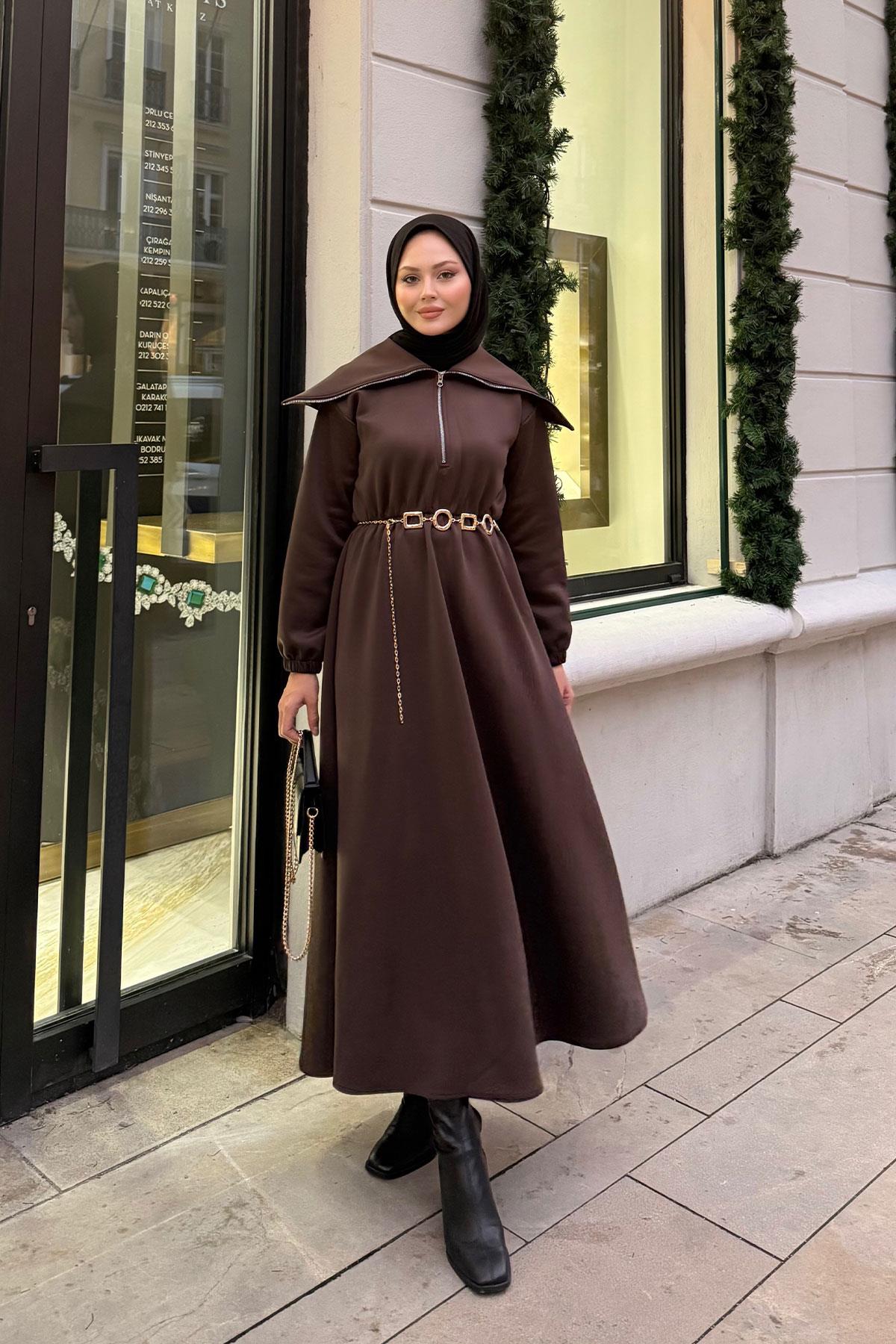 Önü Fermuarlı Elbise Kahverengi