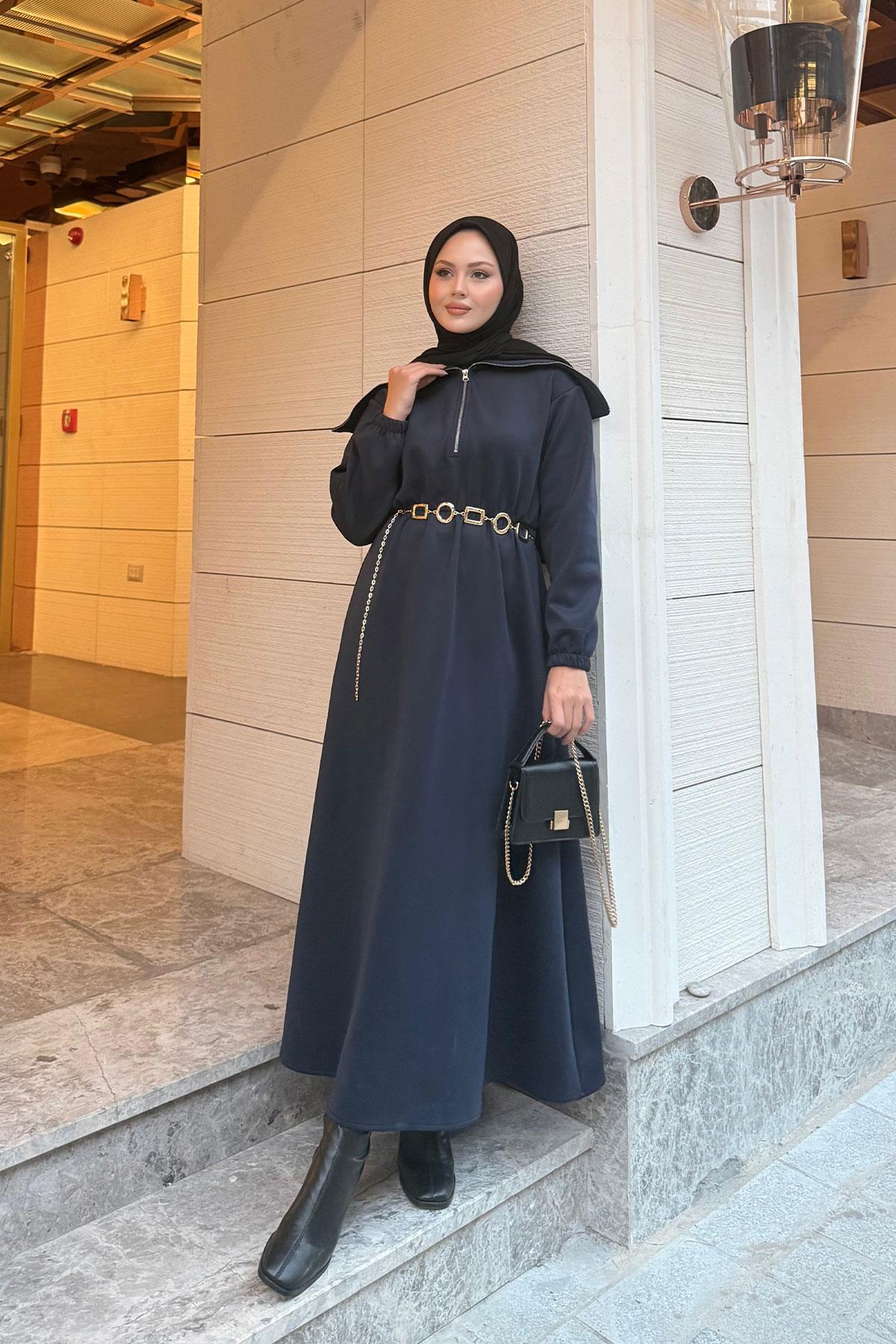 Önü Fermuarlı Elbise Lacivert
